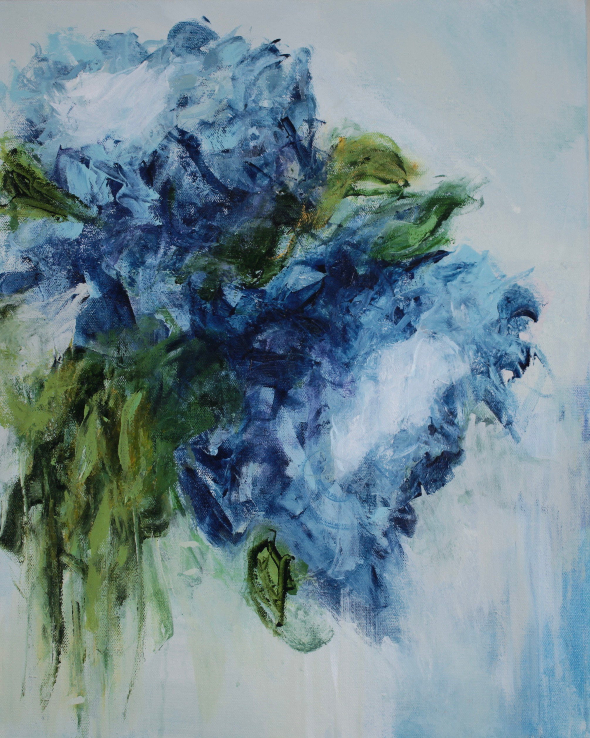 This dark blue expressionist floral painting will brighten your day! The bouquet of dark blue morning glories using navy blue, indigo, and pale blue pair well with the soft greens. The pale warm neutral background really makes the flowers shine. The petals are layered and lightly textured adding a dimension of contrast to this work.