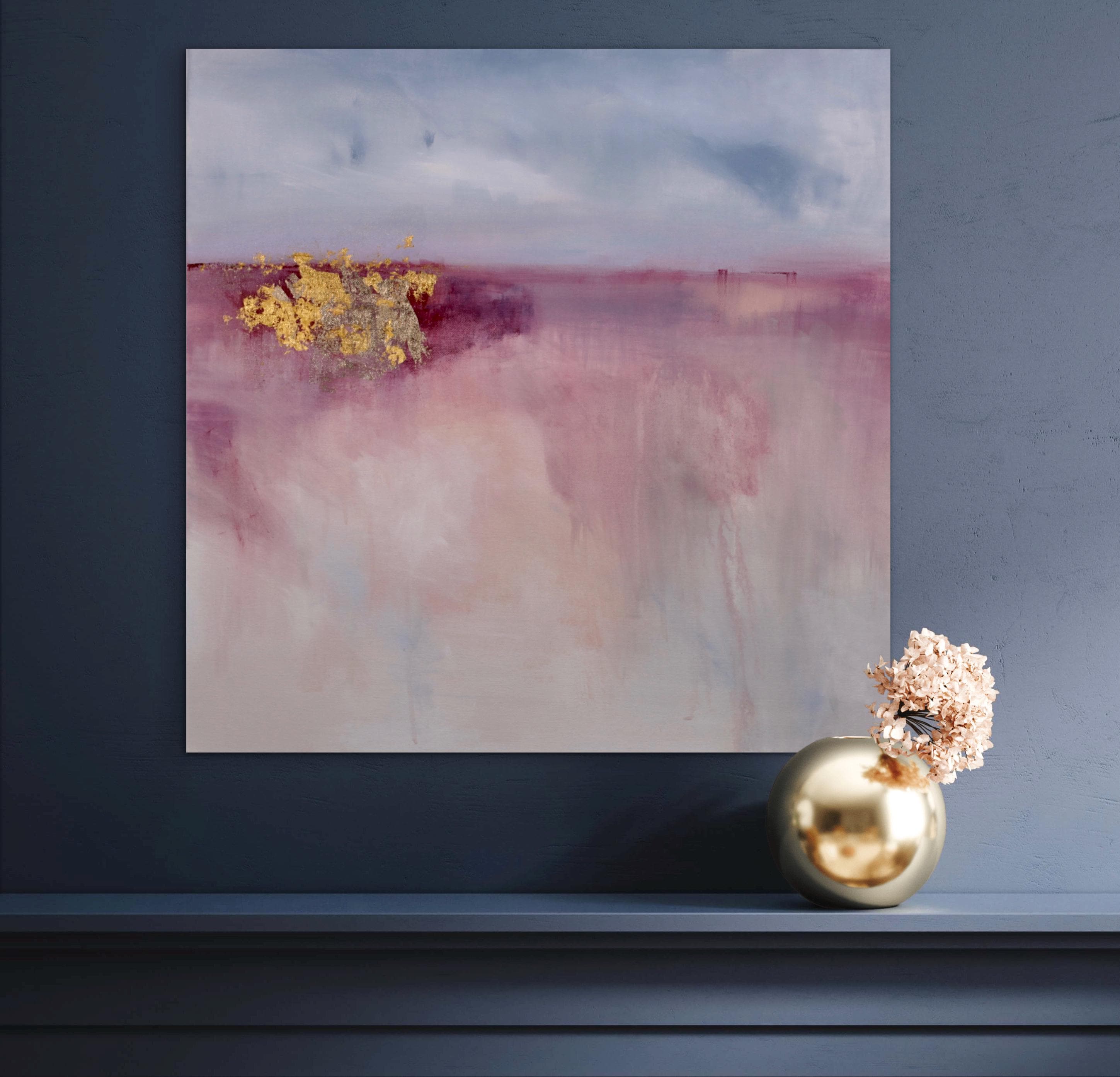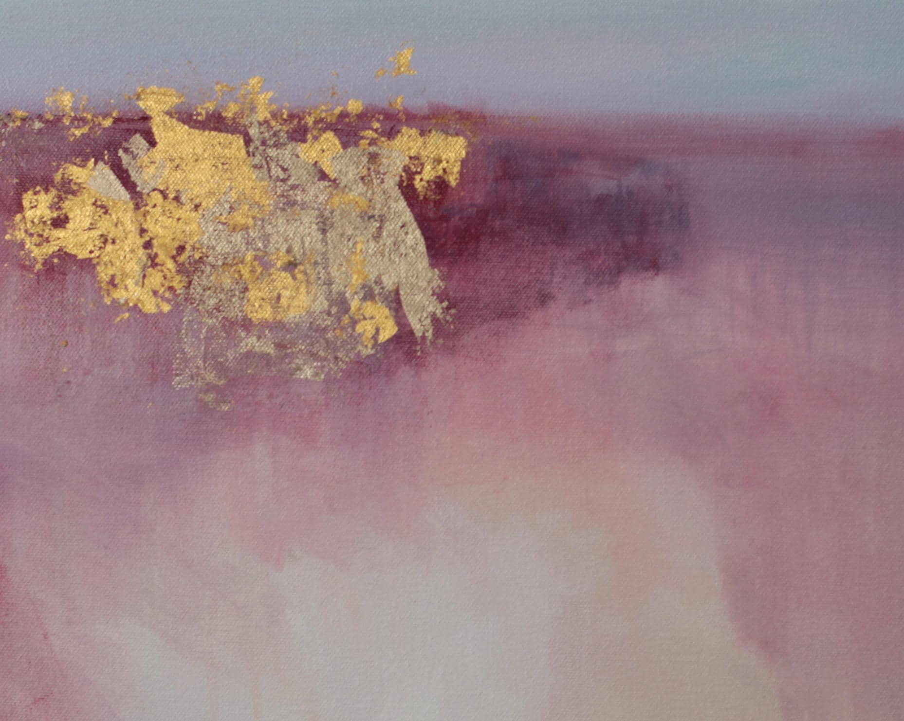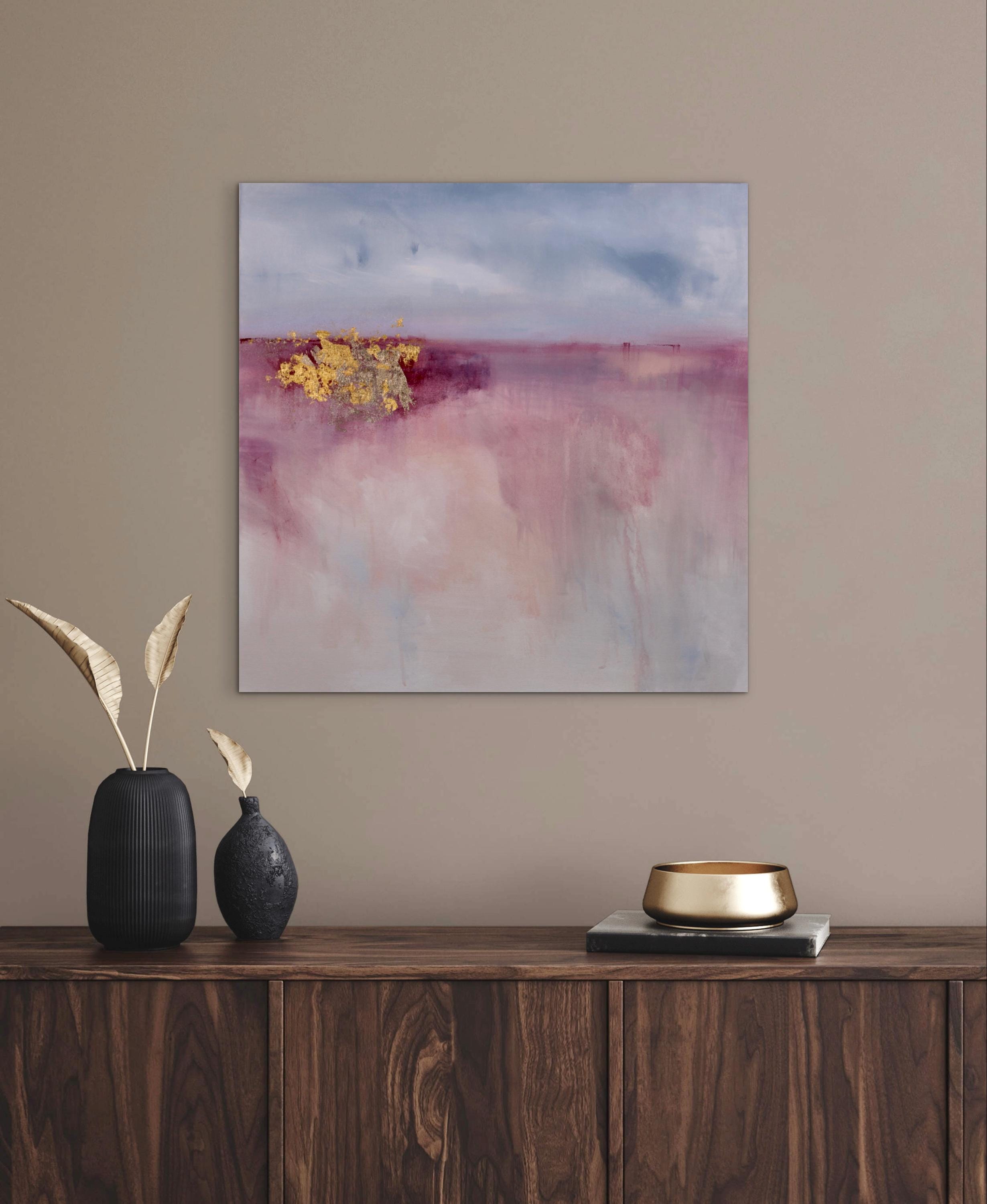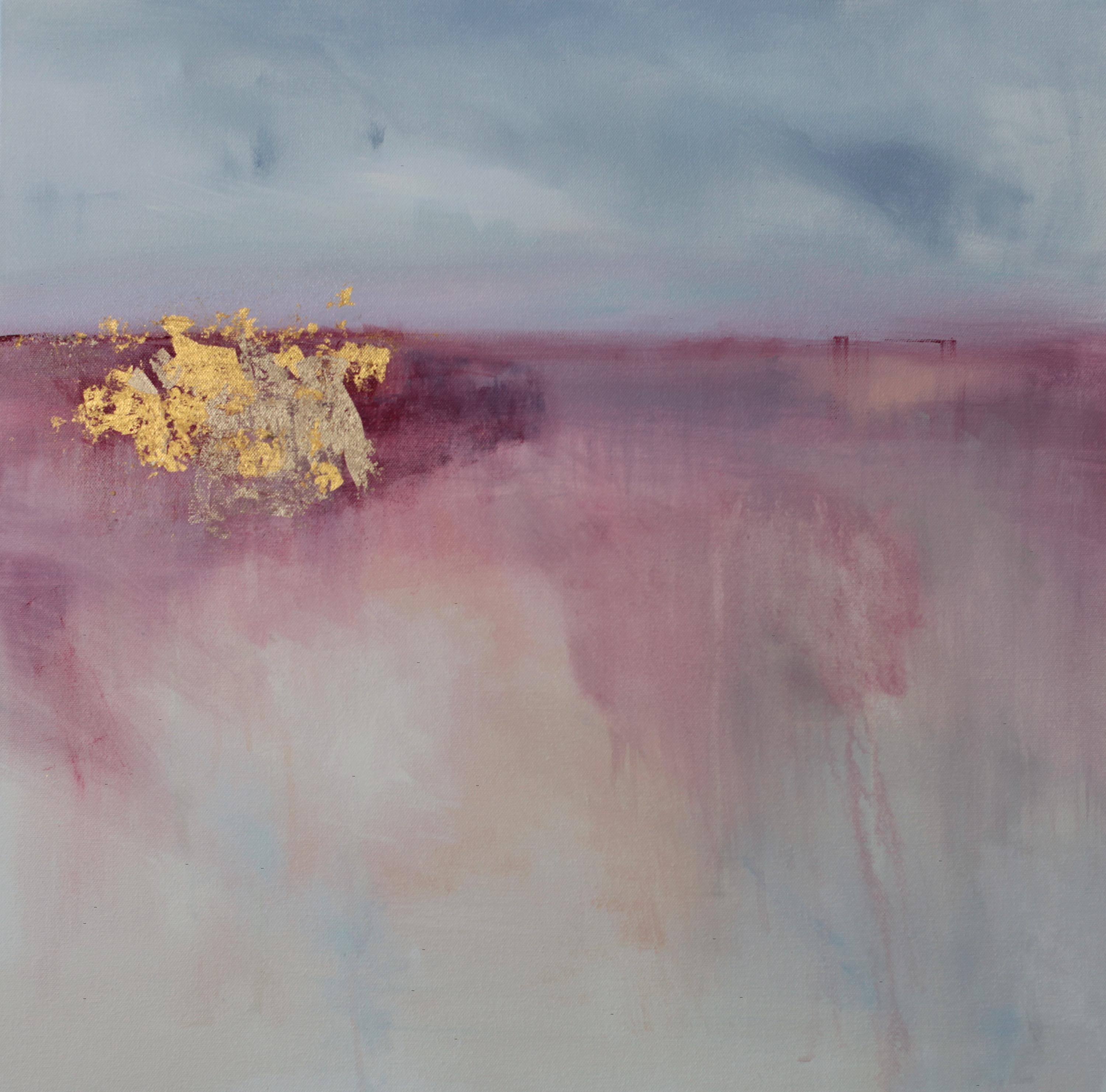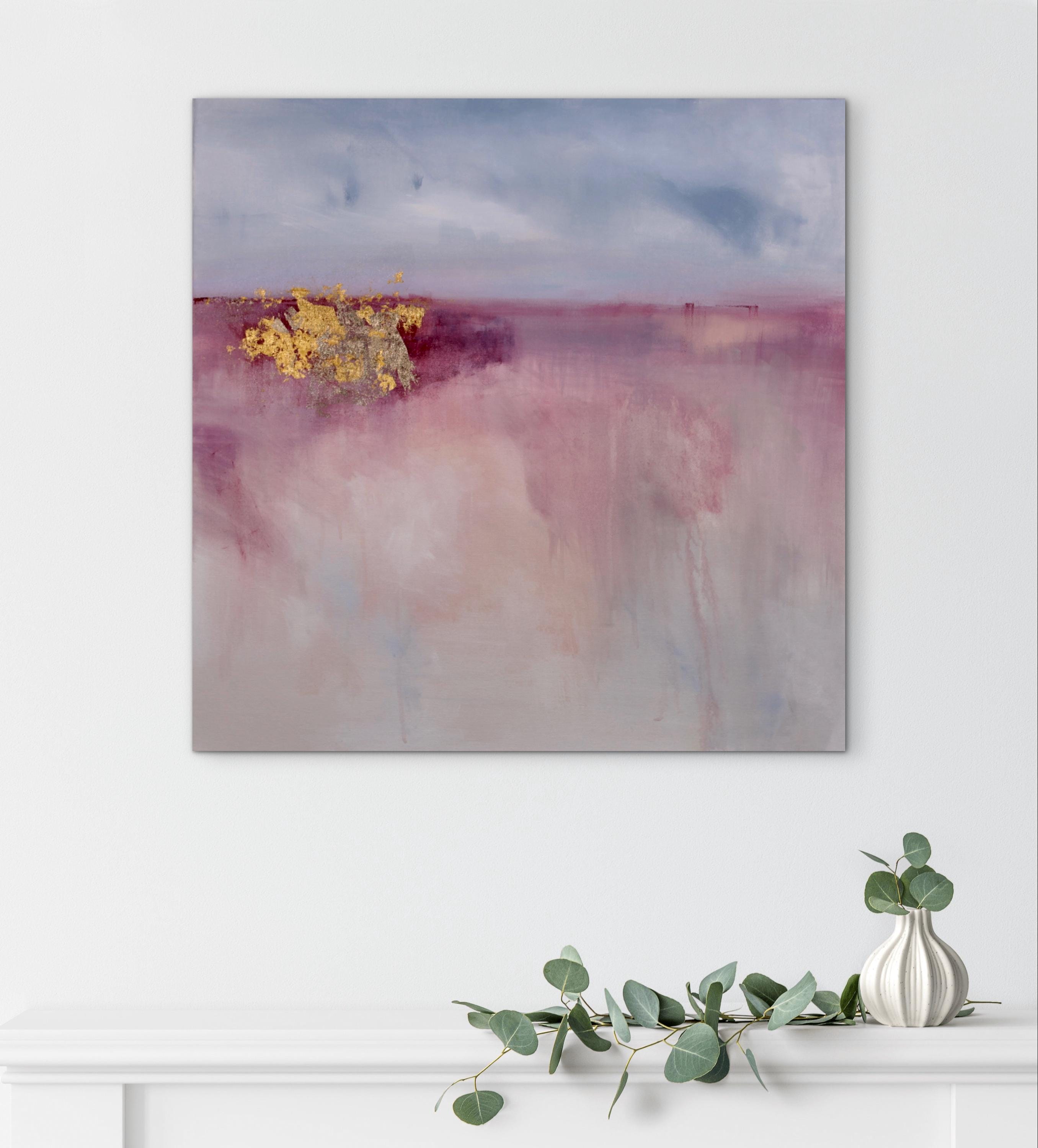 This abstract landscape painting explores the theme of hope through a restrained landscape. Soft layers of mauve, rose, melon, and pale blue dissolve into one another, creating a quiet sense of depth and openness. A horizontal division suggests a distant horizon, while areas of 24k and 22k gold leaf emerge as points of light, introducing contrast and a sense of renewal. The composition balances fragility and strength, using subtle texture and muted color to evoke optimism. Subtle shifts in color, delicate marks, and drips contribute to the painting’s depth, creating vertical movement and a quiet tension.