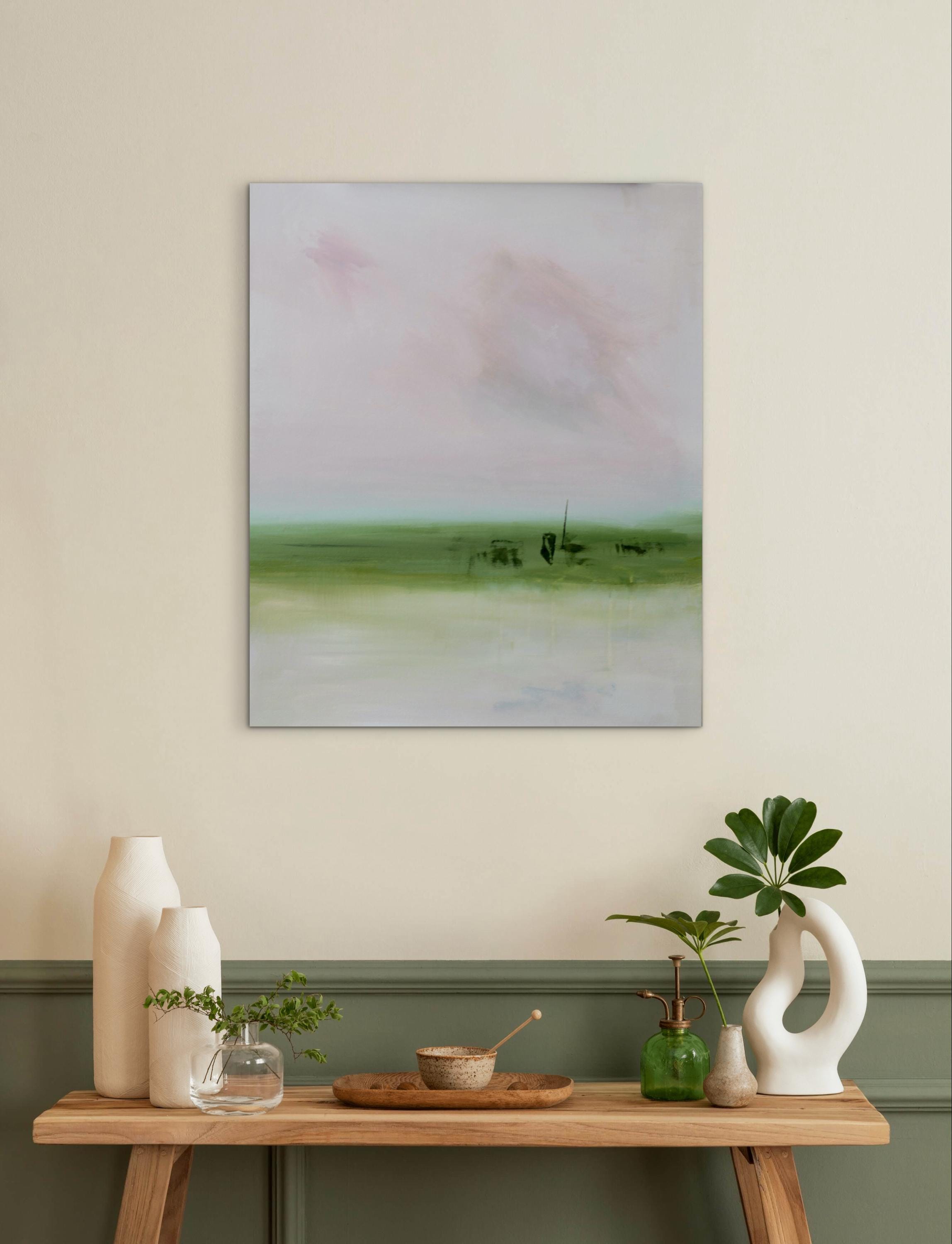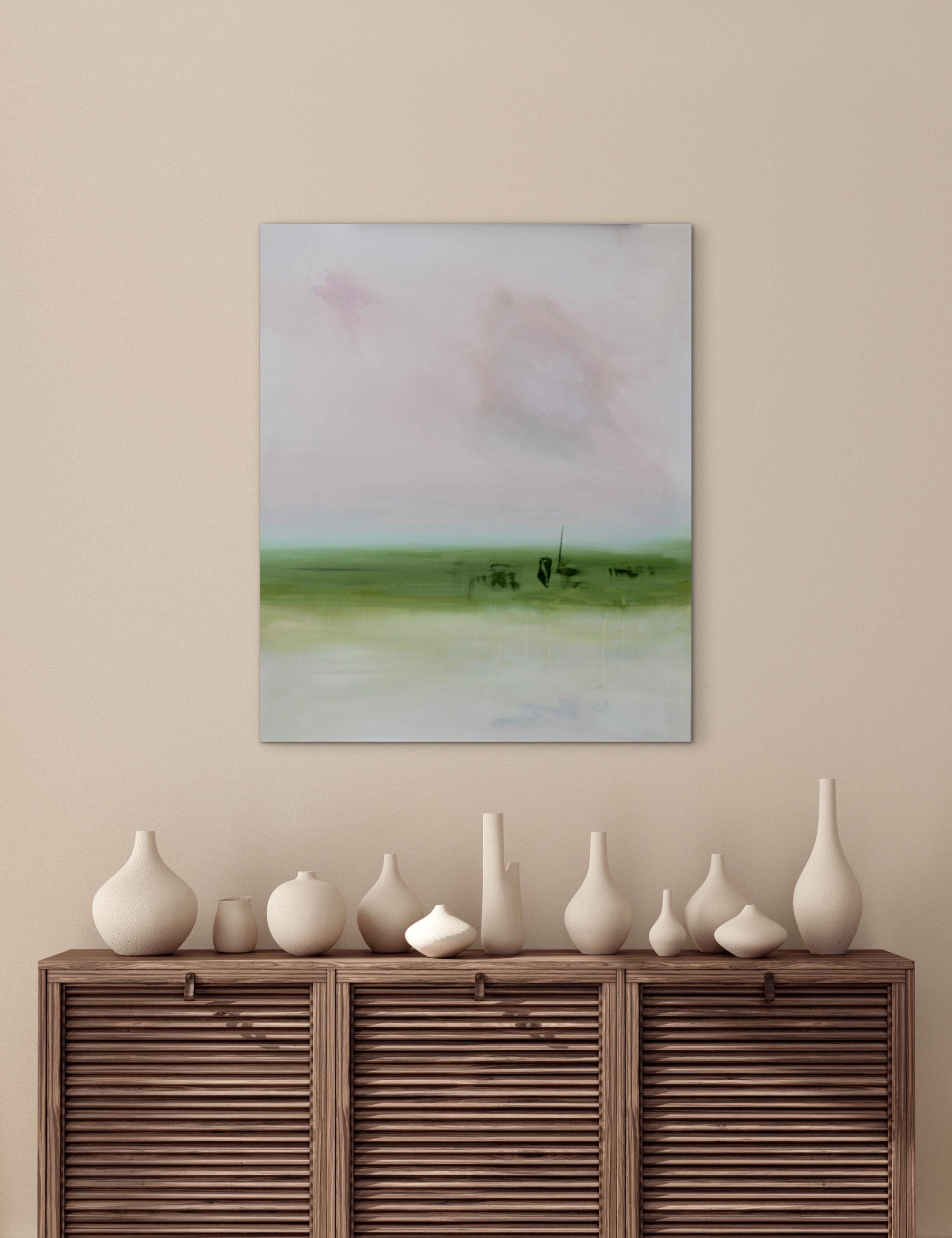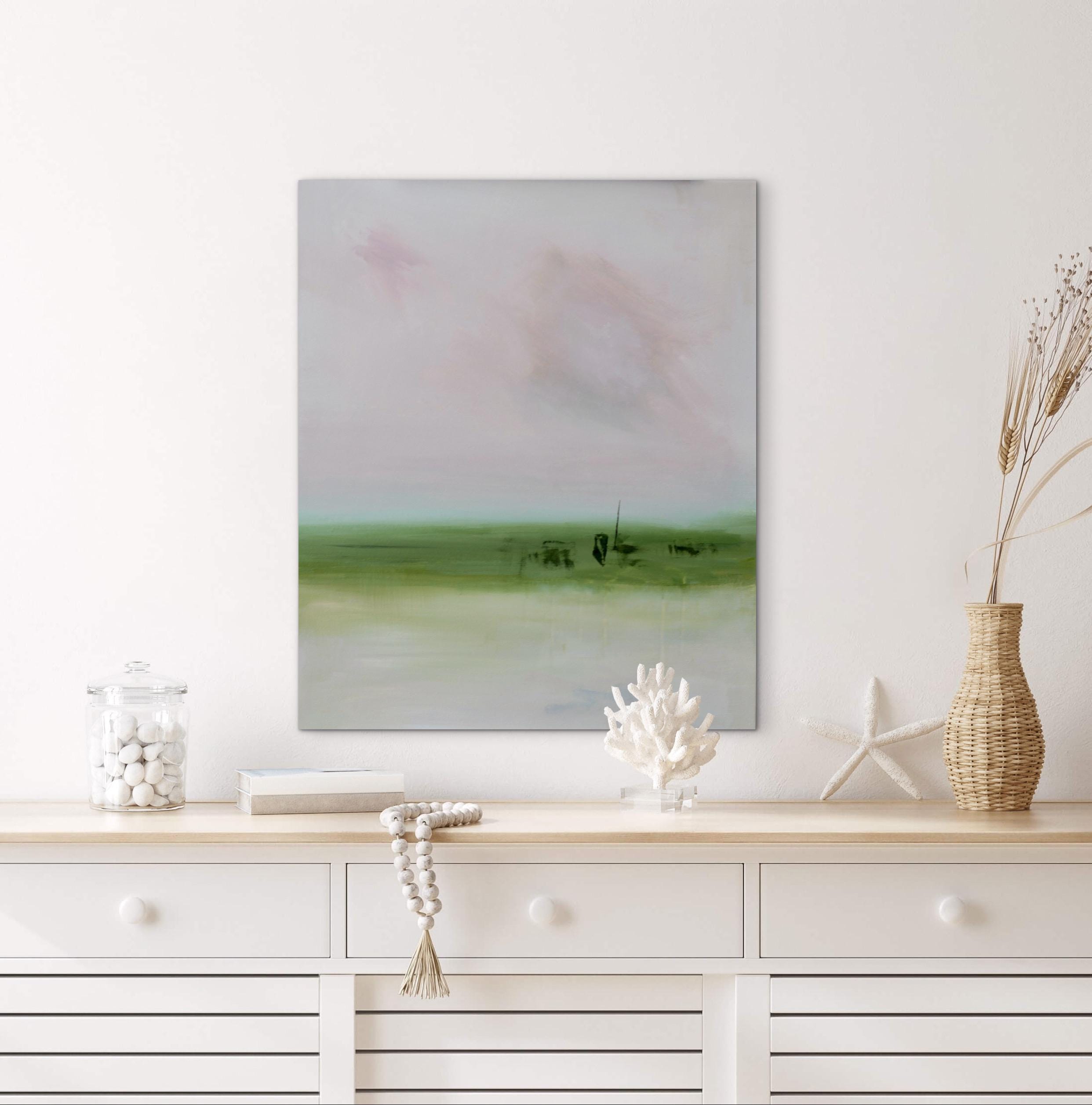 This light pink abstract landscape painting is a quiet meditation on hope and renewal. Soft layers of light pink, dusty rose, and beige dissolve into one another, creating a quiet sense of depth and openness. There is a hint of aqua blue above the low green horizon, suggesting the first light of morning. The painting holds a moment of anticipation—where uncertainty remains, but light is beginning to emerge. Subtle shifts in color, delicate marks, and drips feel optimistic.