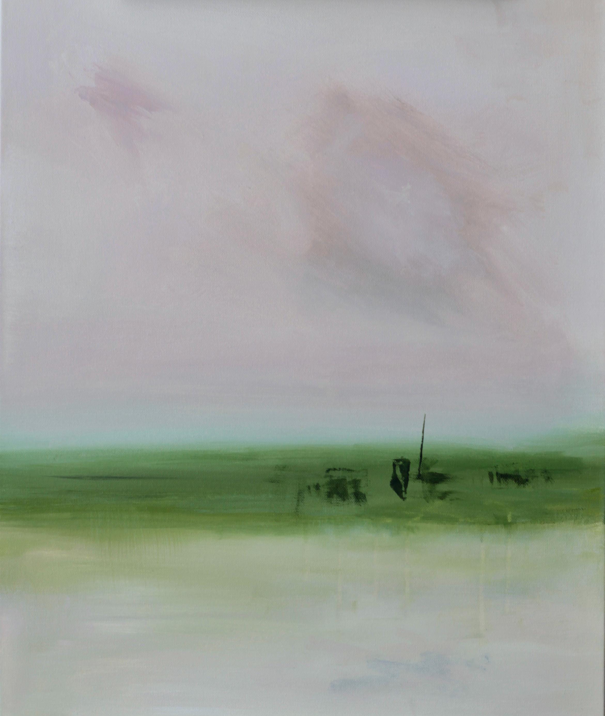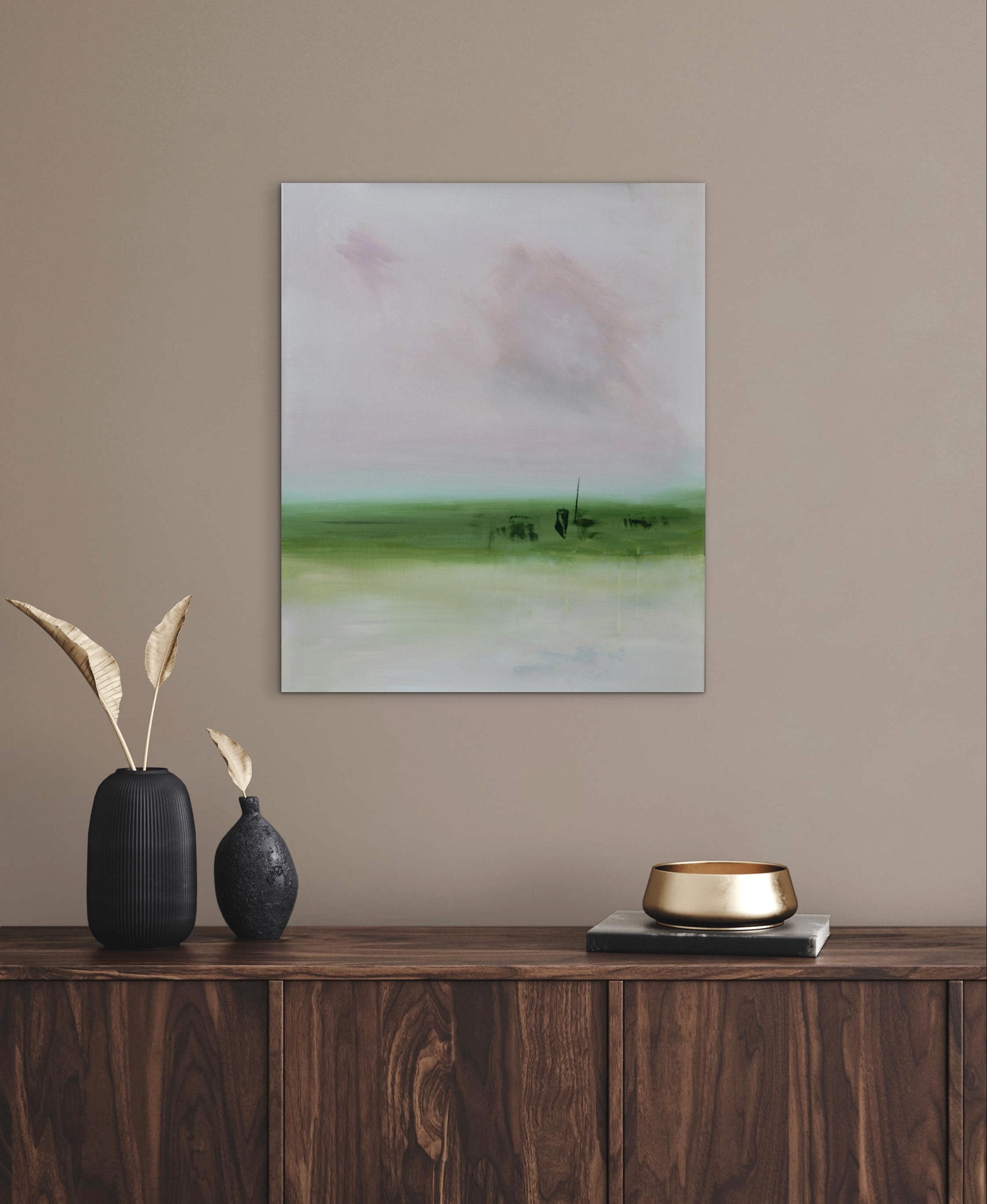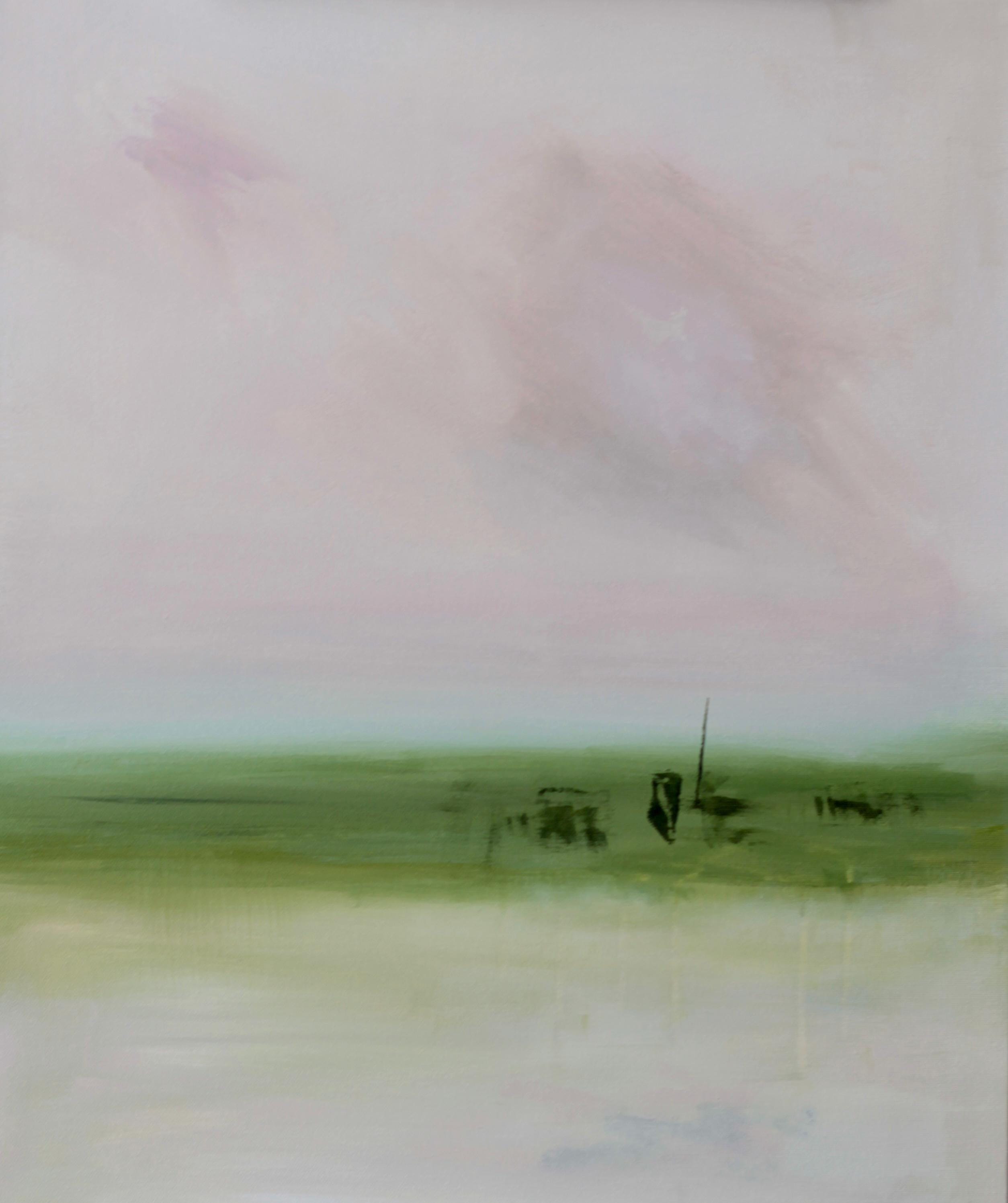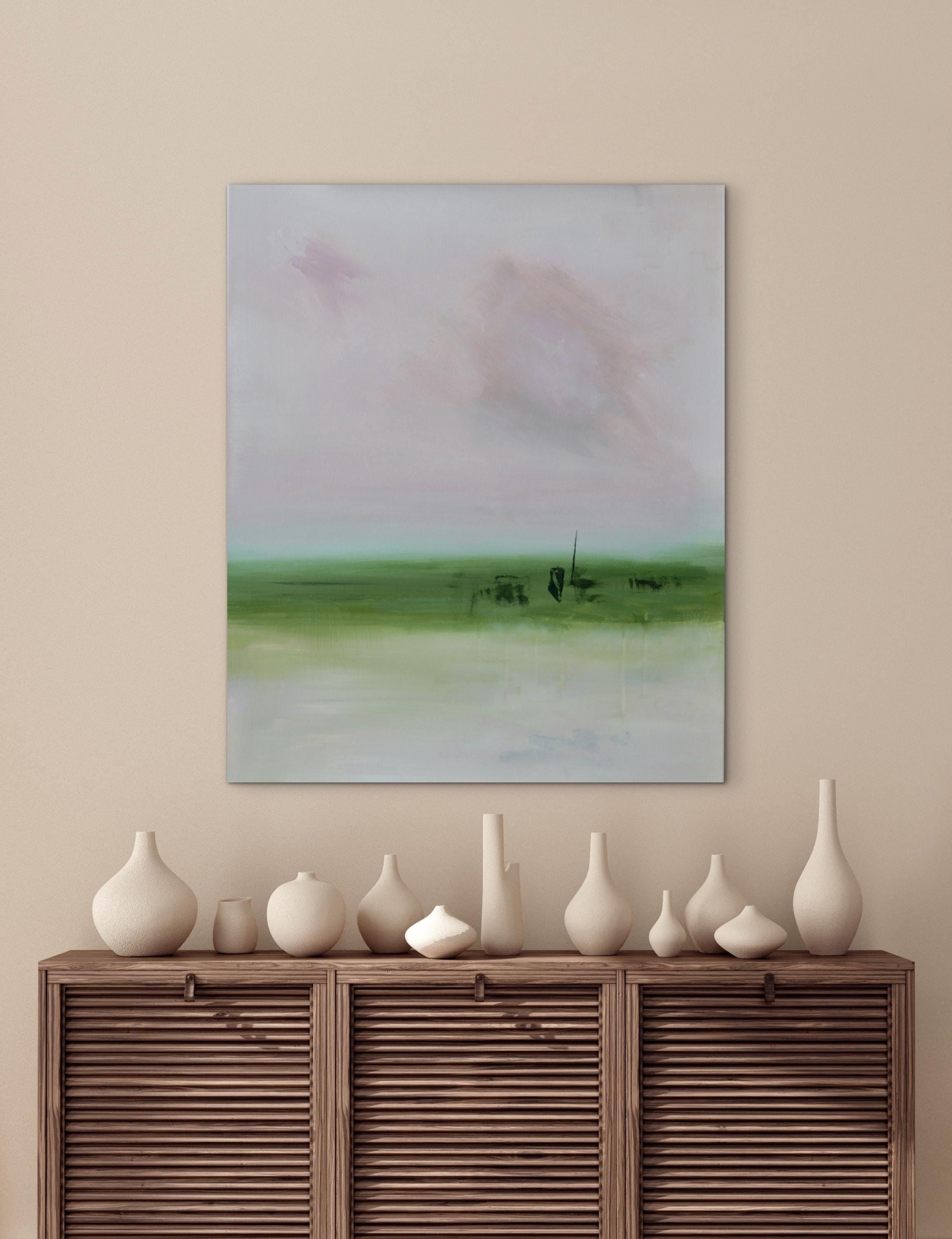 This light pink abstract landscape painting is a quiet meditation on hope and renewal. Soft layers of light pink, dusty rose, and beige dissolve into one another, creating a quiet sense of depth and openness. There is a hint of aqua blue above the low green horizon, suggesting the first light of morning. The painting holds a moment of anticipation—where uncertainty remains, but light is beginning to emerge. Subtle shifts in color, delicate marks, and drips feel optimistic.
