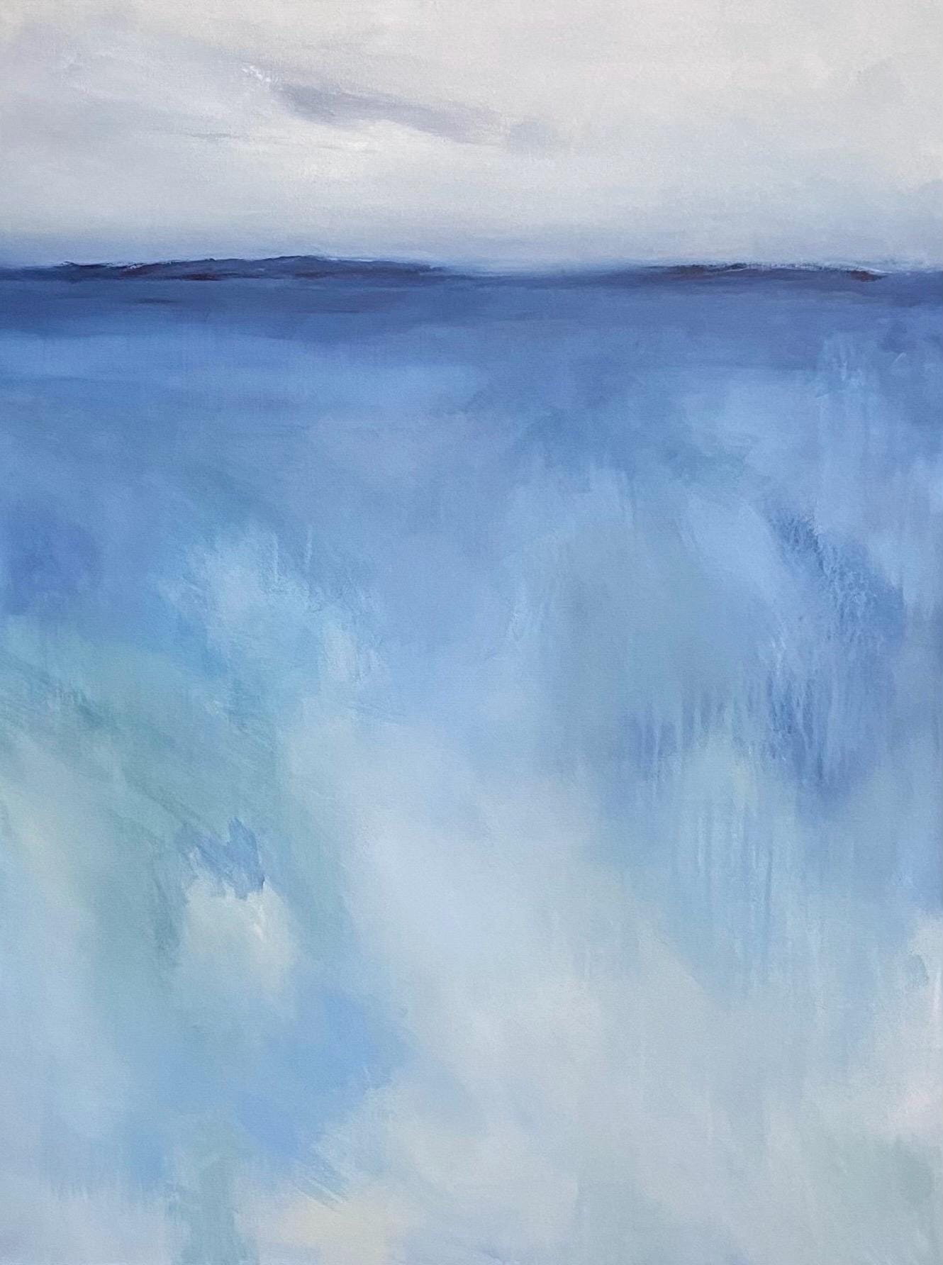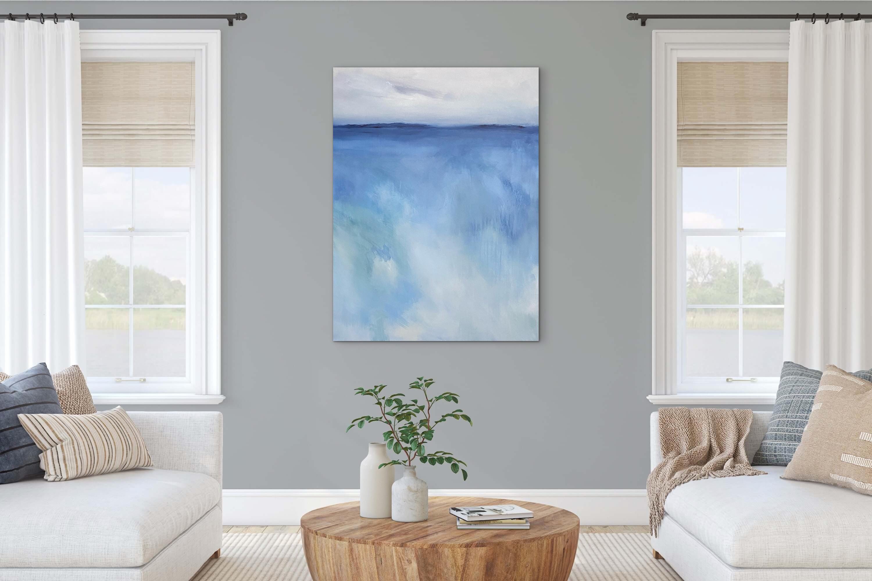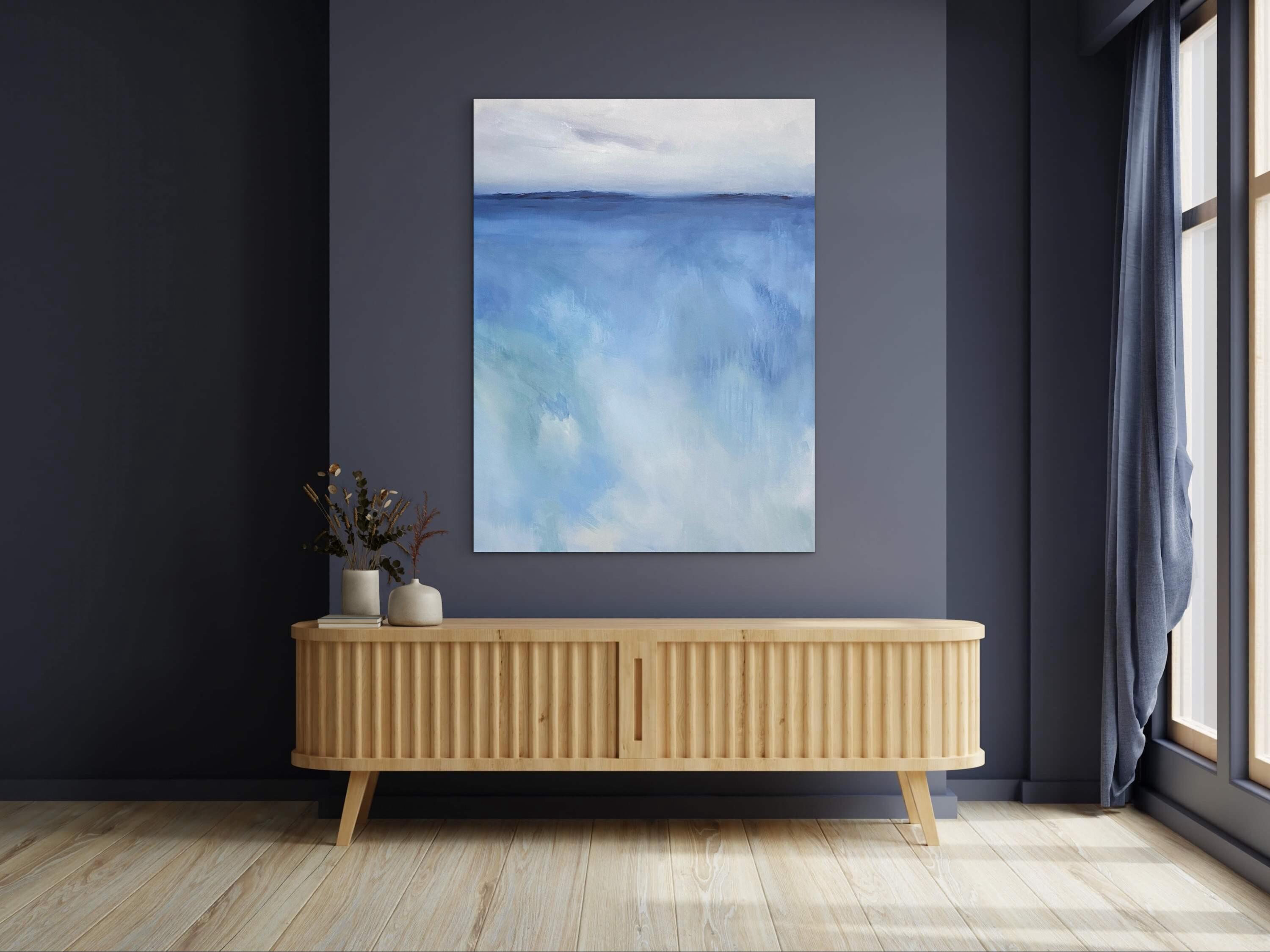 The horizon line remains calm and understated, offering a point of balance within the openness. Below it, the movement of color feels intuitive and unforced, carrying a quiet energy that suggests reflection and presence. The lighter areas create space for rest, while deeper blues add a sense of grounding and continuity.
