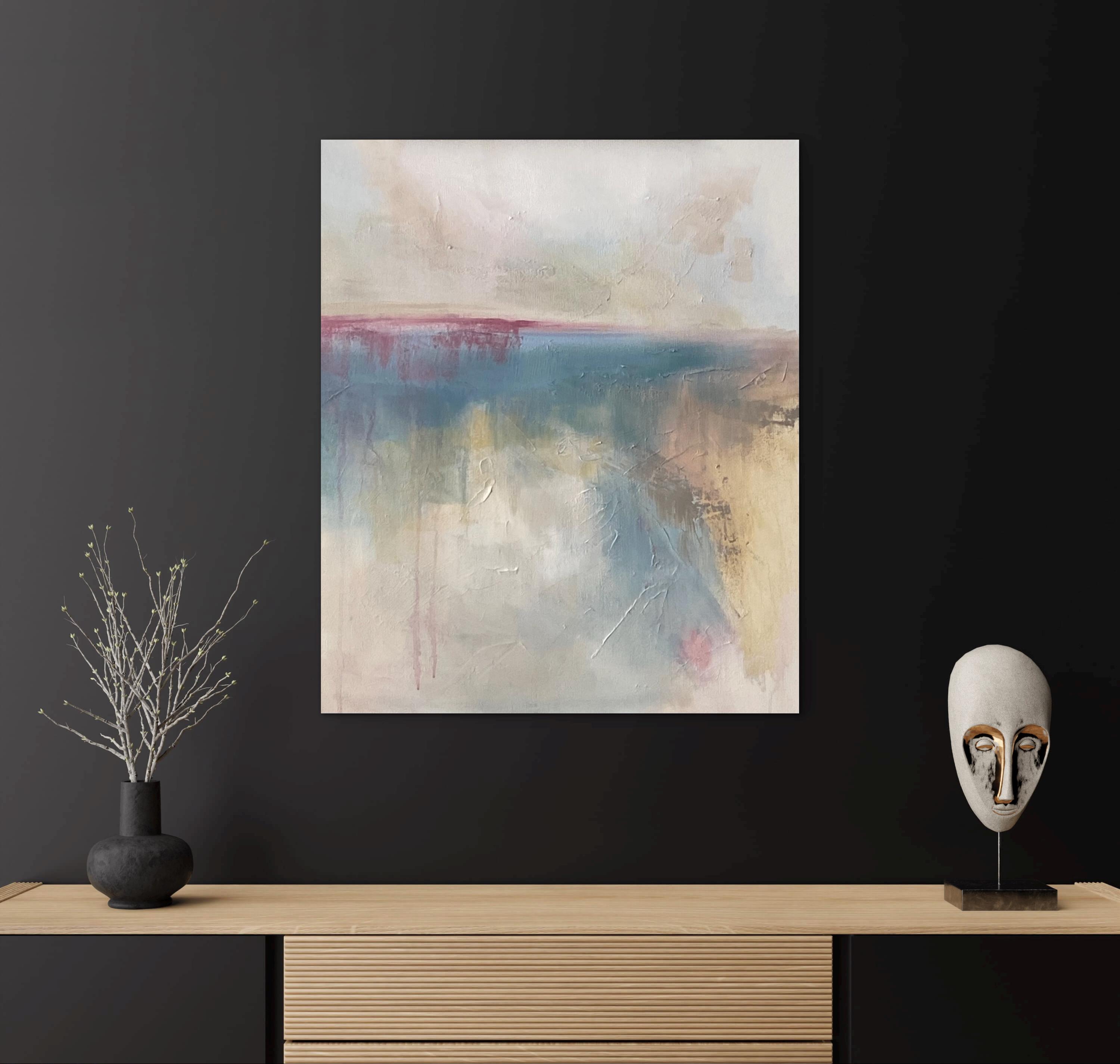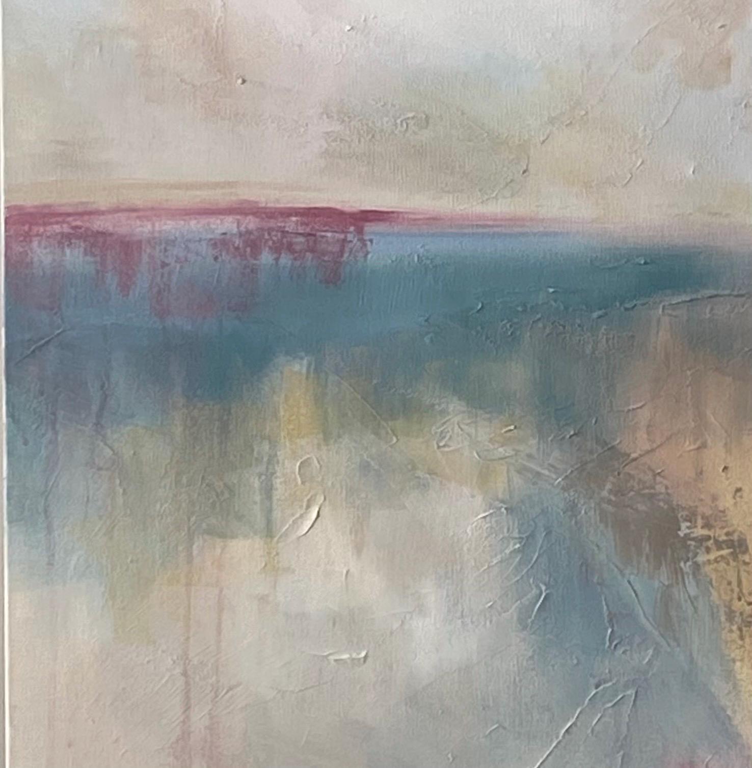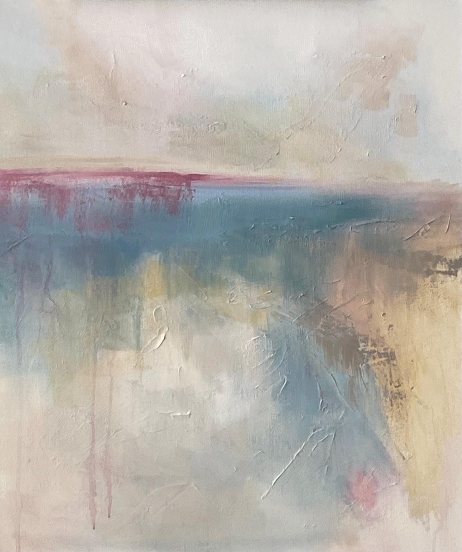 Layers of ocean blue and shifting warm neutrals evoke the tides of the sea. A brush of rose along the horizon brings warmth into the cooler tones, symbolizing renewal emerging from turbulence. Textural marks and softened edges give the piece a sense of vulnerability — as though it is still becoming. There is space within the composition to breathe and reflect.