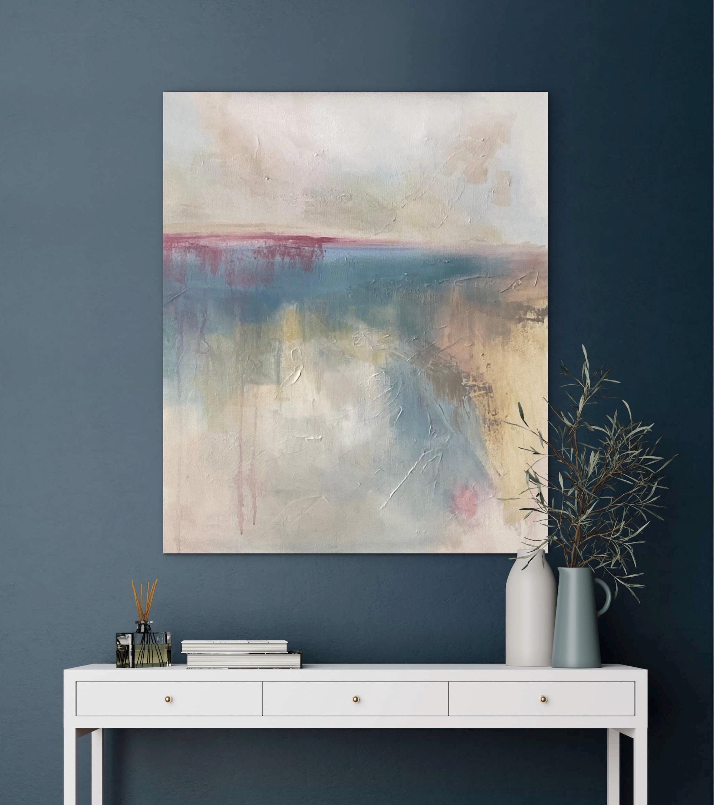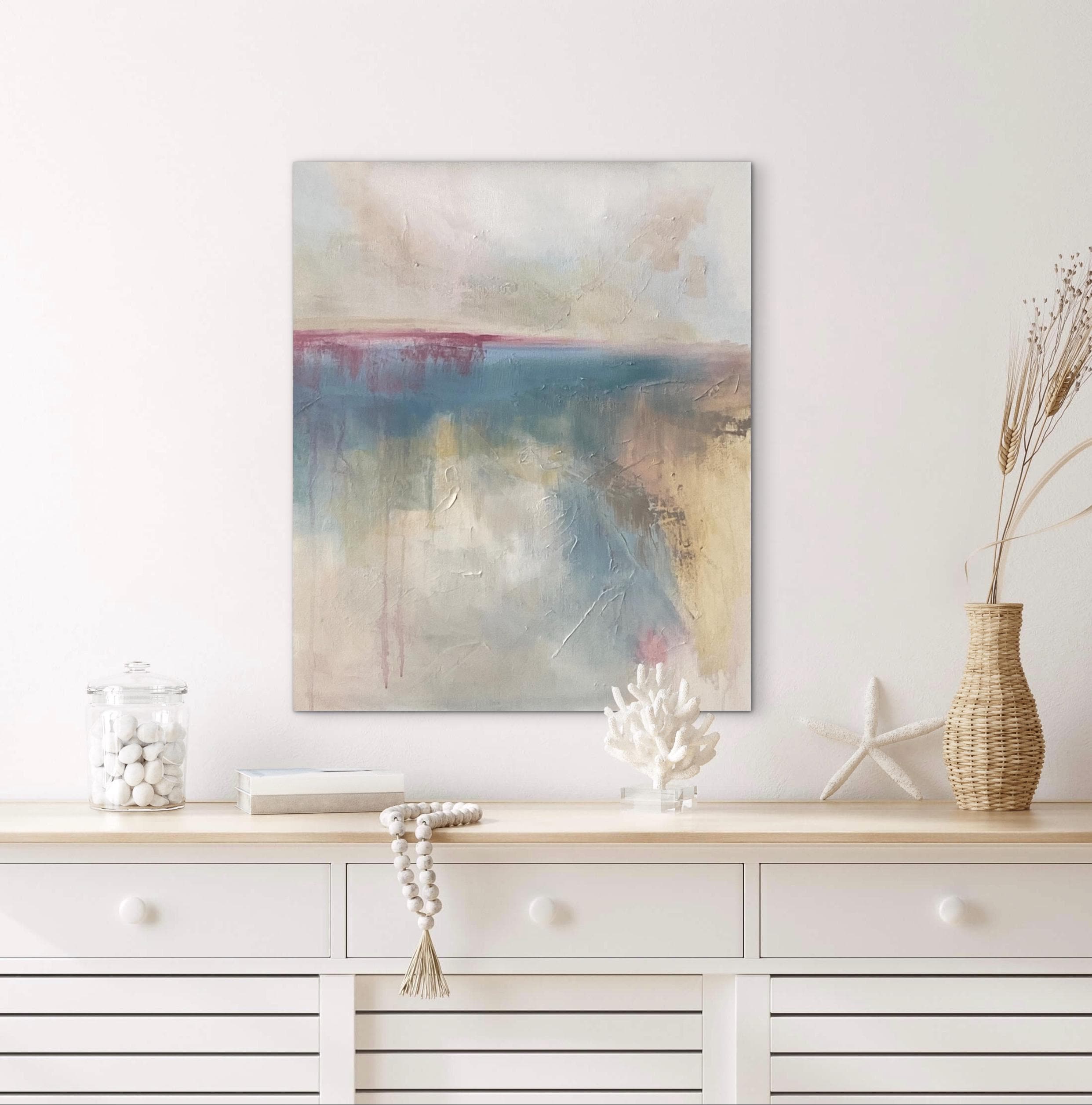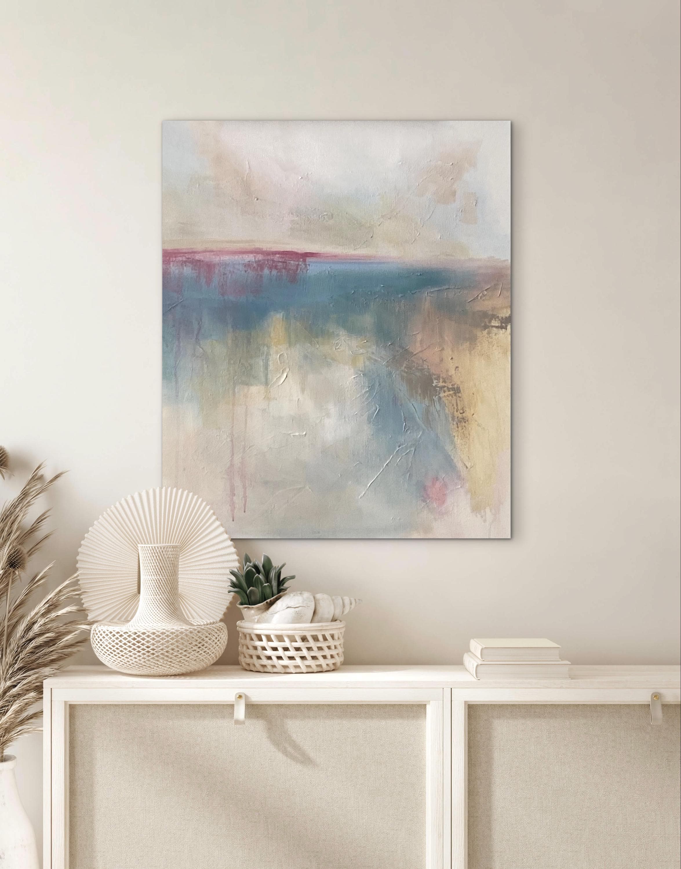 Layers of ocean blue and shifting warm neutrals evoke the tides of the sea. A brush of rose along the horizon brings warmth into the cooler tones, symbolizing renewal emerging from turbulence. Textural marks and softened edges give the piece a sense of vulnerability — as though it is still becoming. There is space within the composition to breathe and reflect.