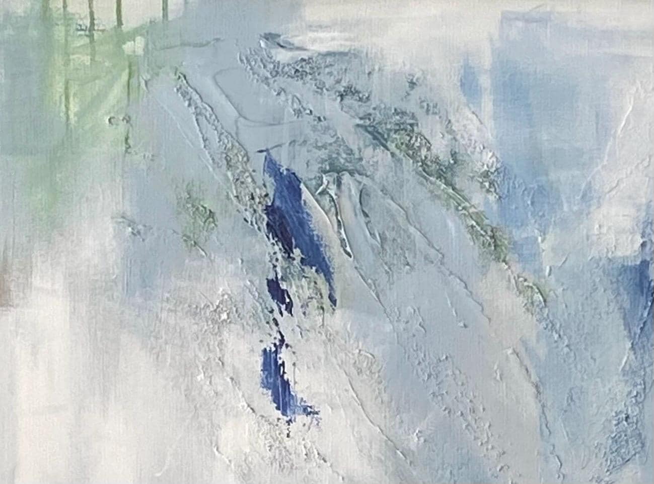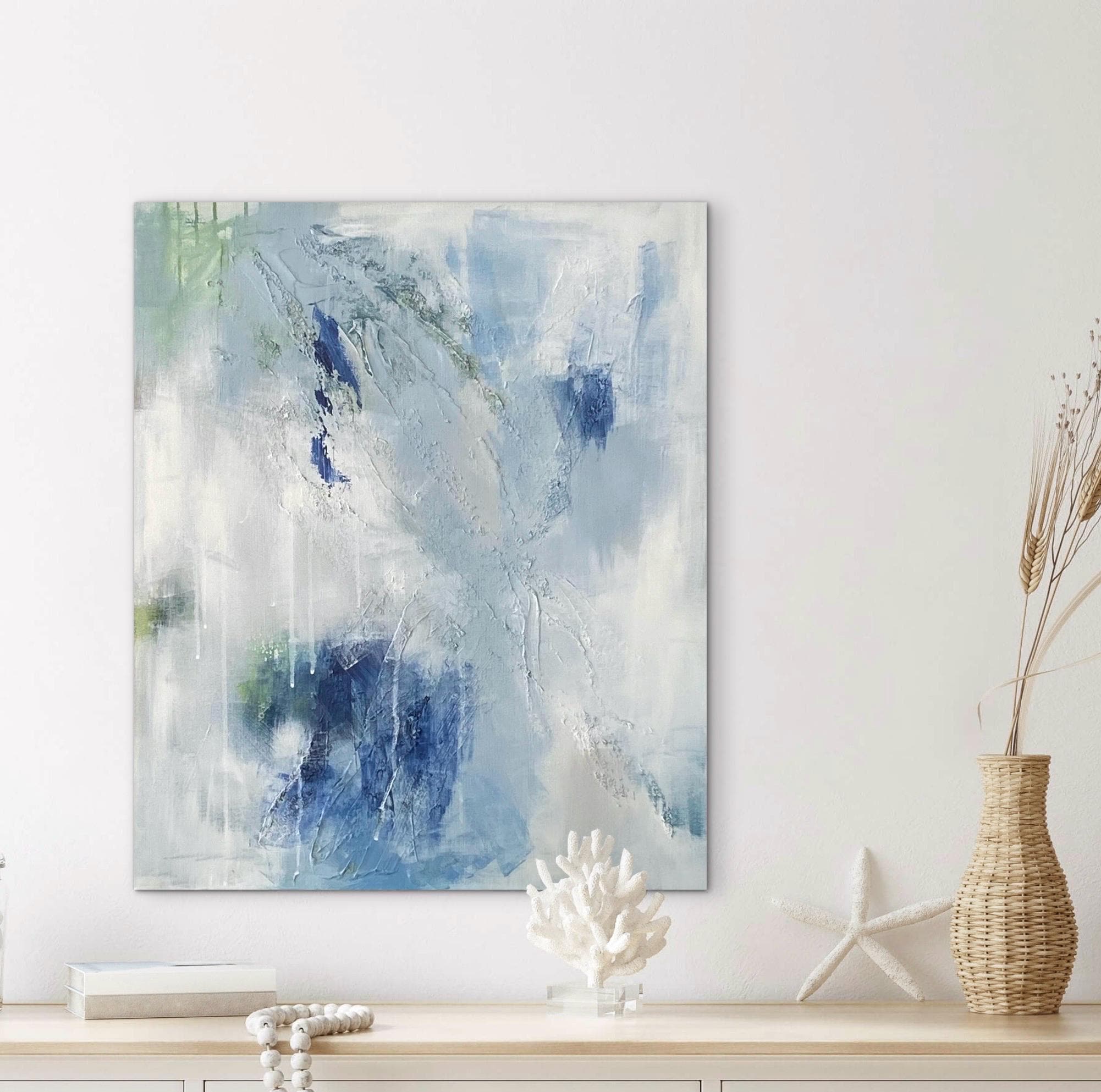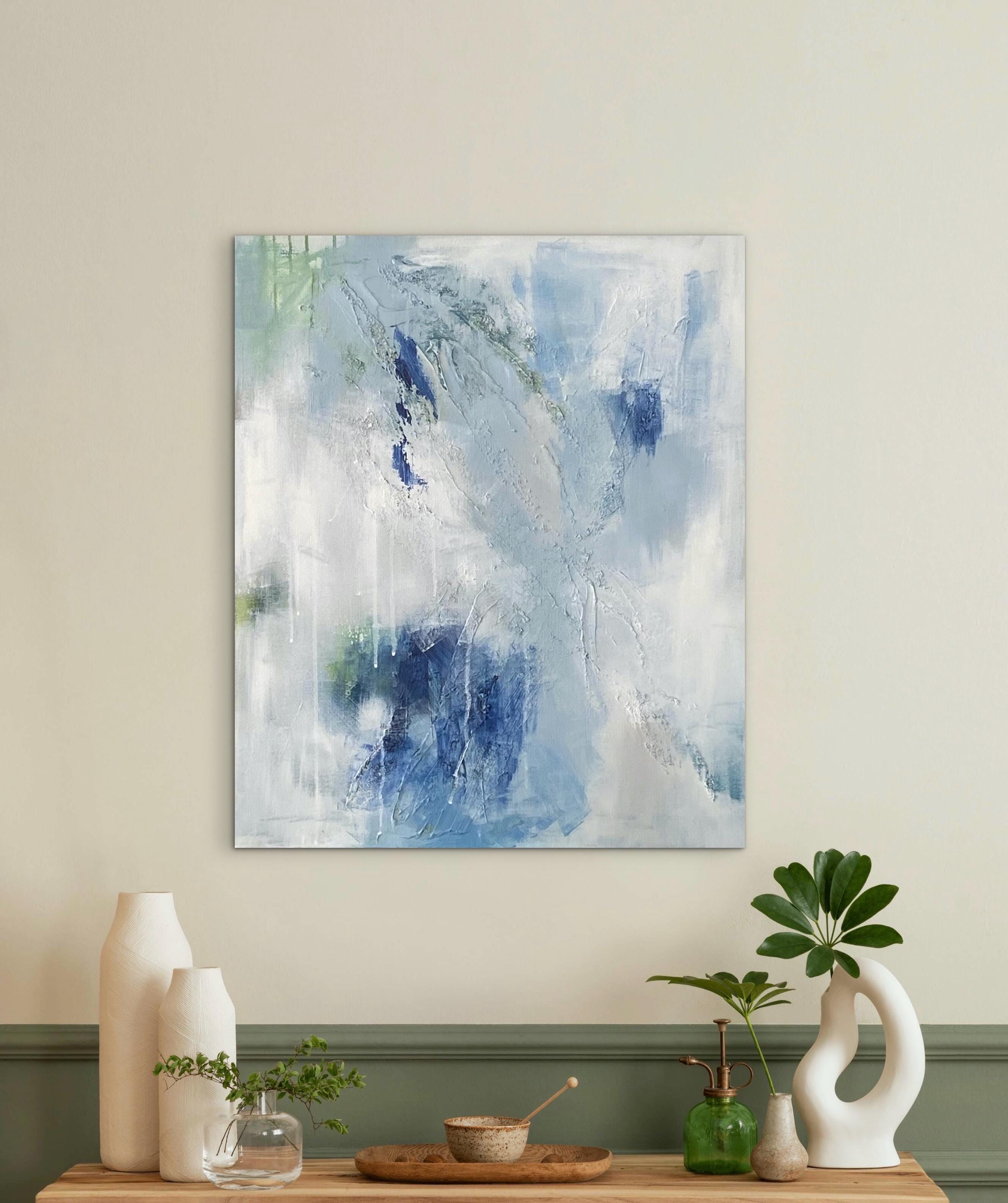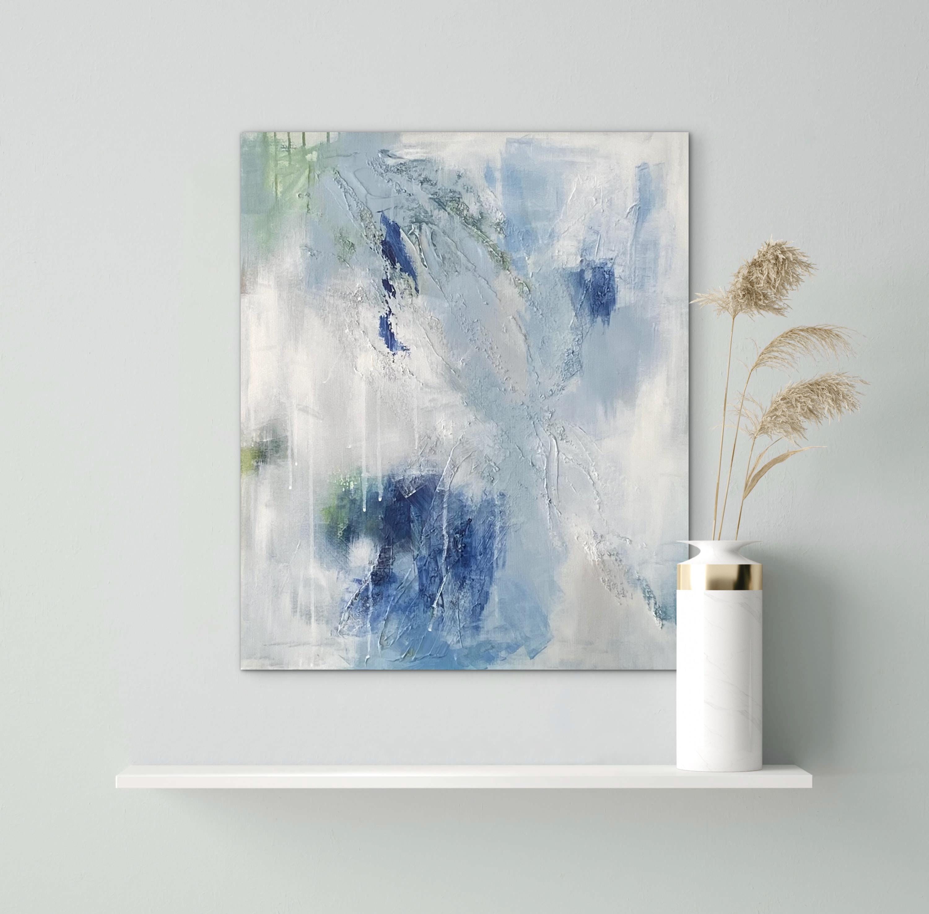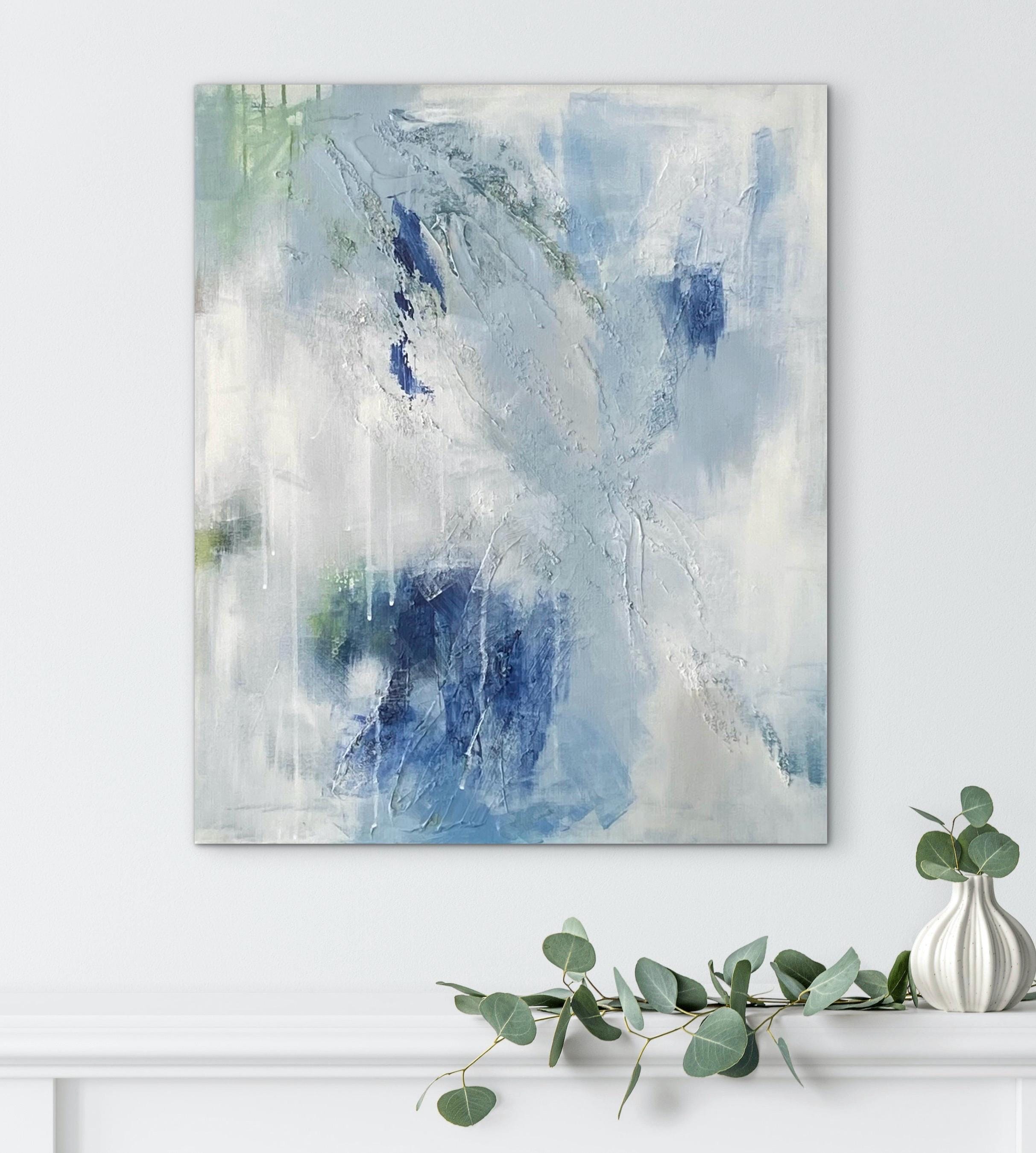 This serene textured abstract painting was inspiried the balance between fragility and strength. Soft washes of blue-gray and off-white create an atmosphere of serenity, while the darker blue and green tones emerge. The airy composition moves across the canvas like drifting clouds or calm water, creating a sense of lightness and breath.