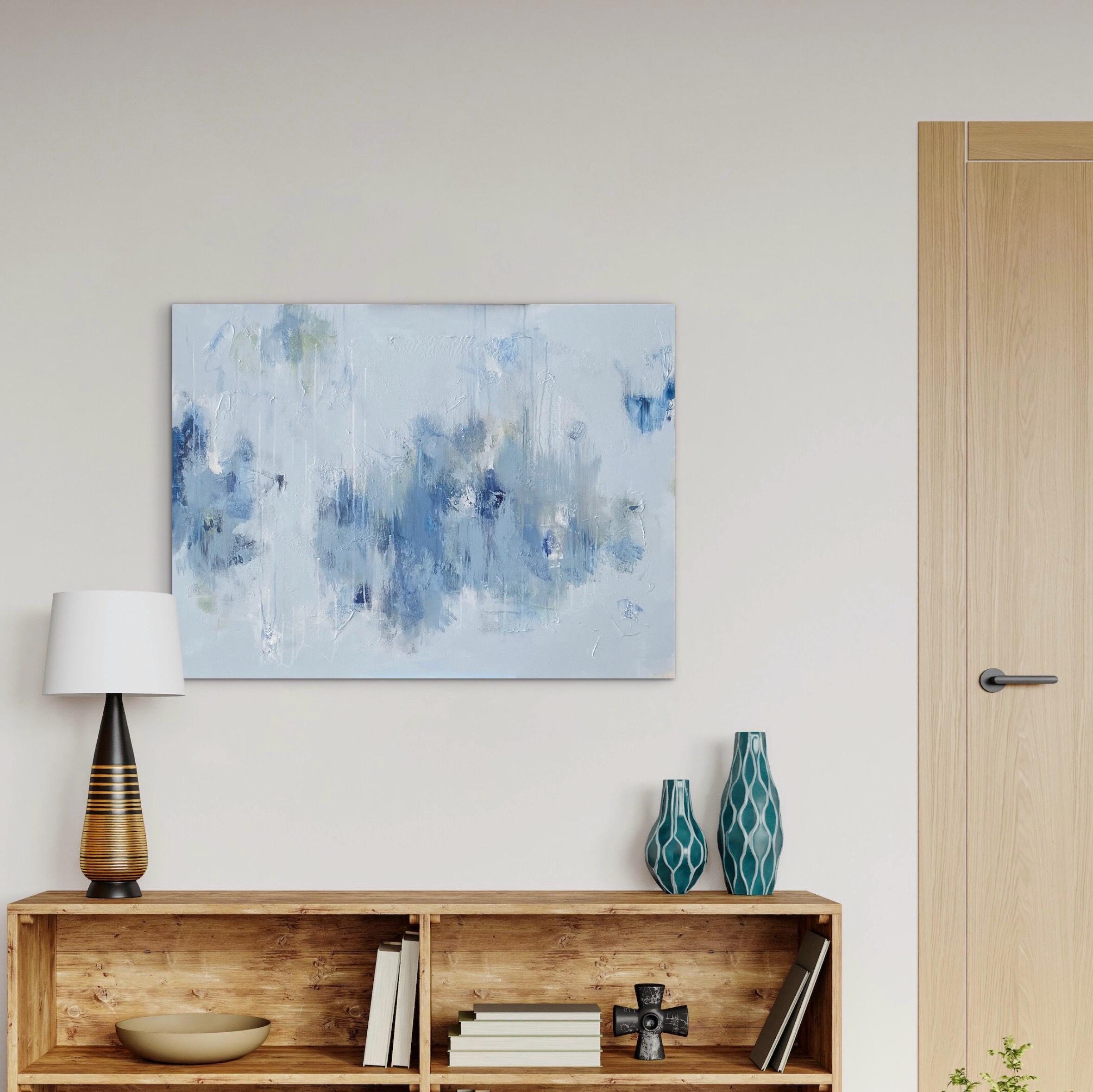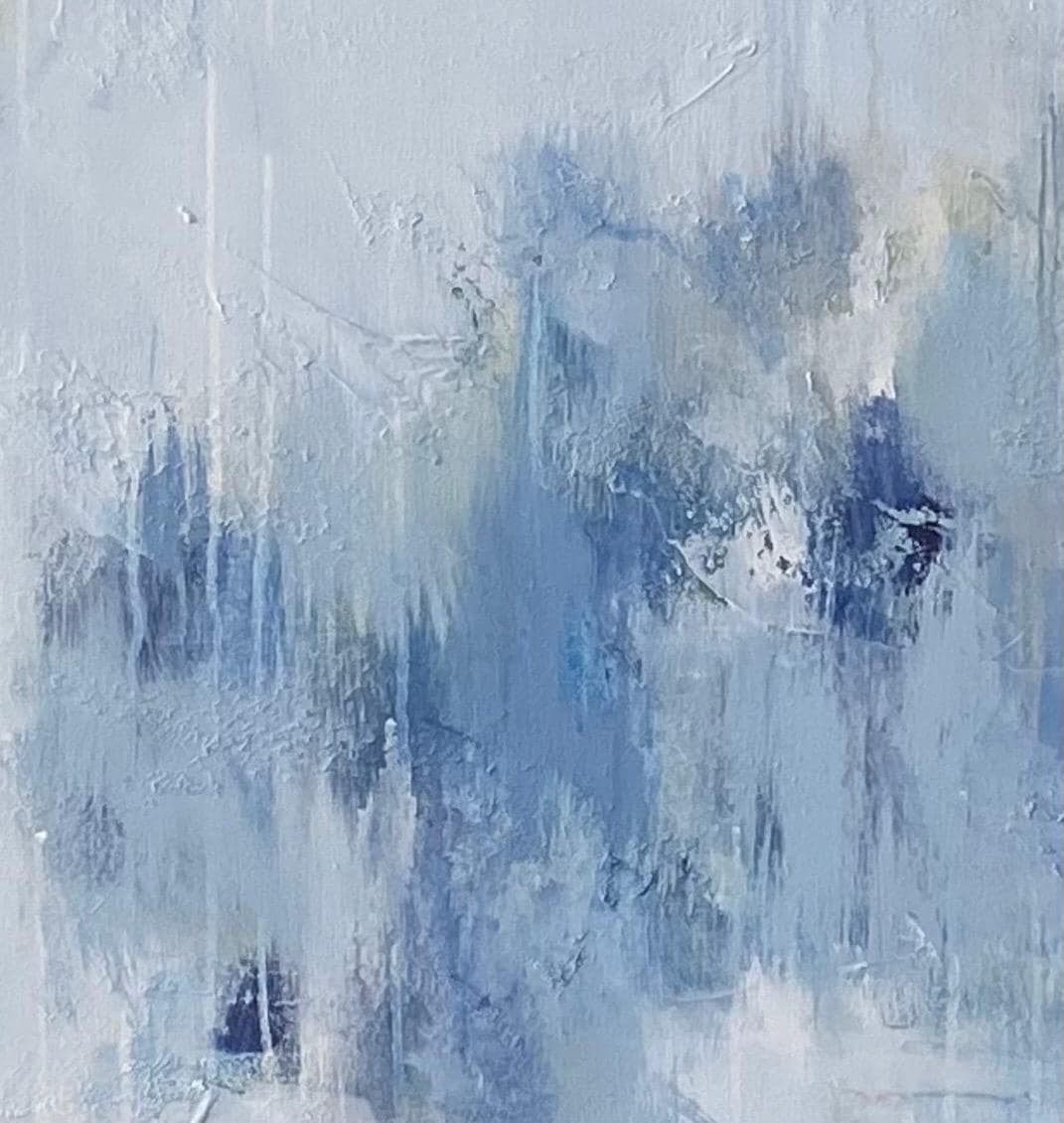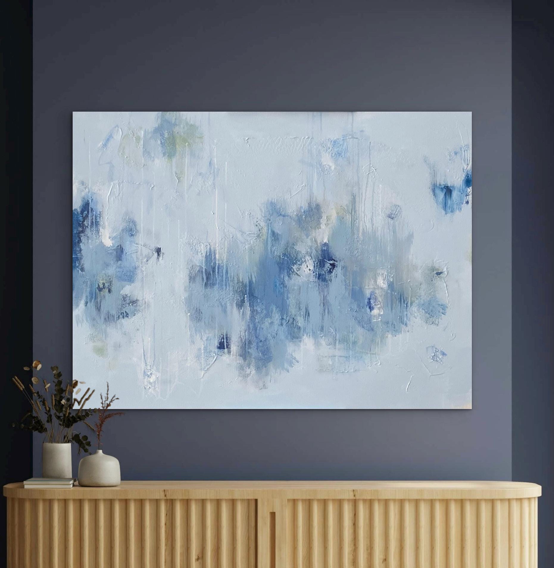 This textured abstract painting is a reflection of inner peace. Soft layers of both warm and cool muted blues drift across the surface, creating a gentle rhythm of movement and rest. The composition feels open yet grounded, as if something has slowly come into balance.