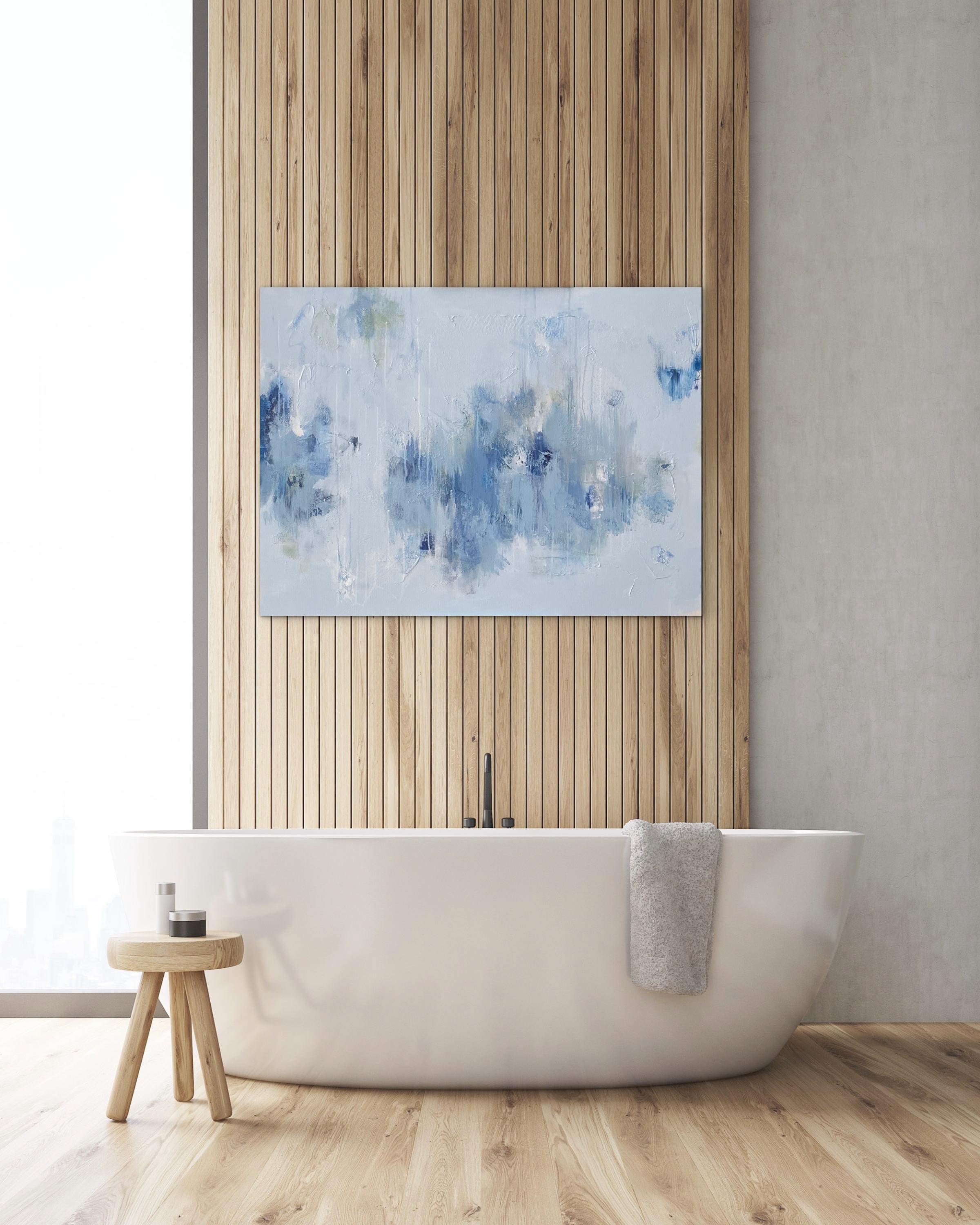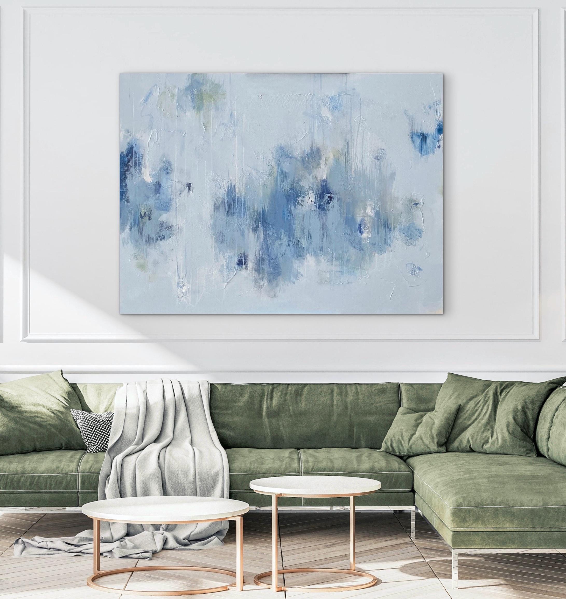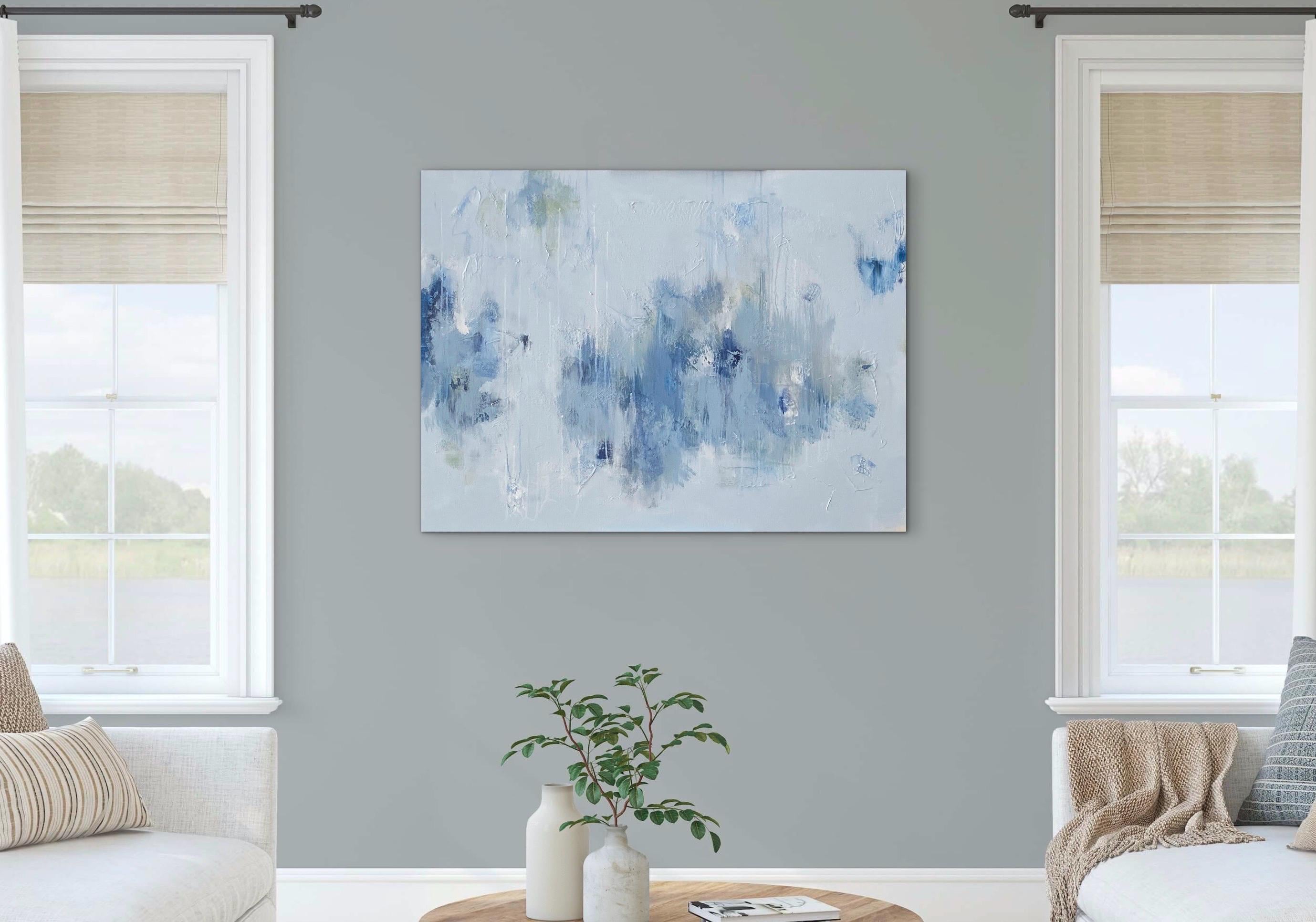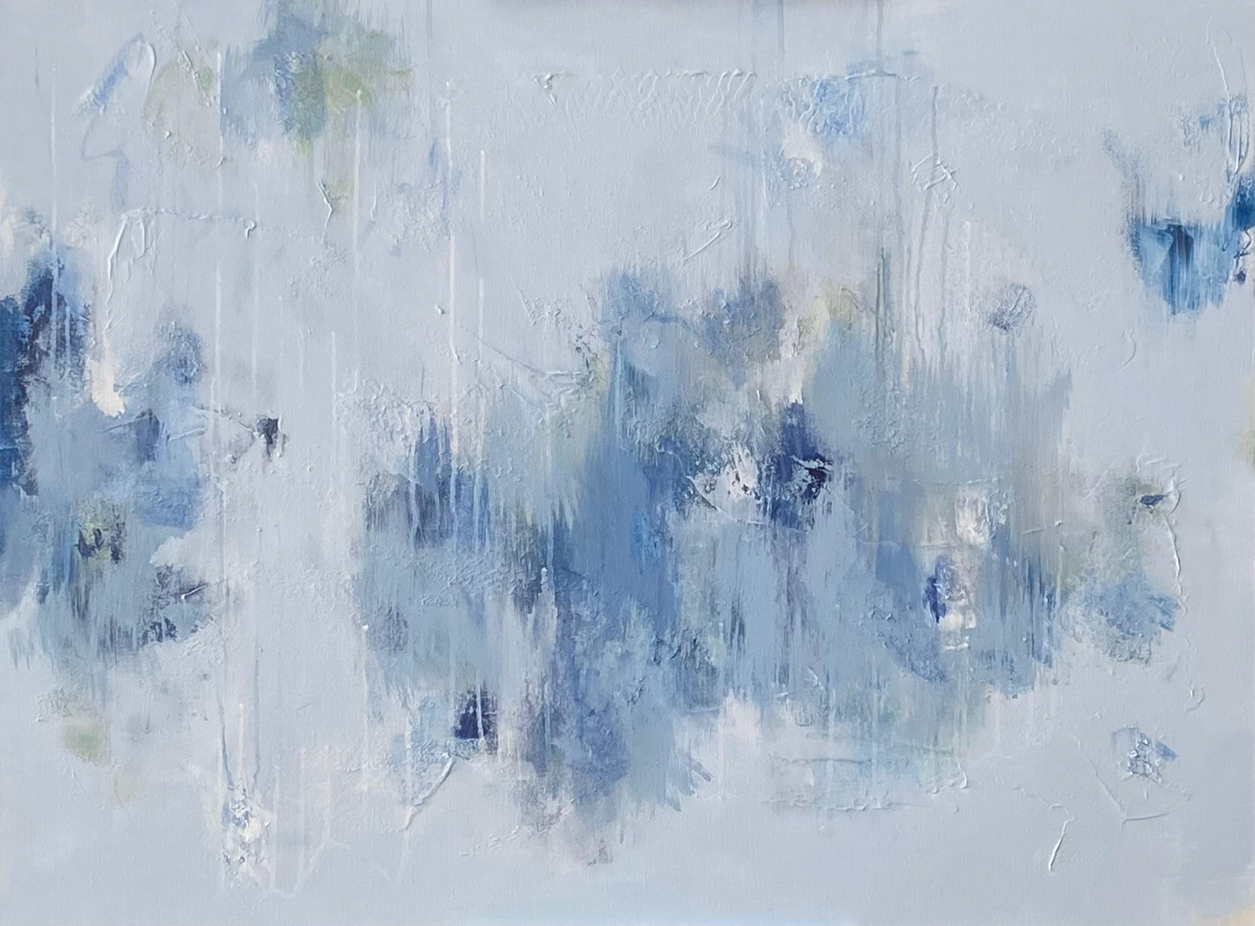 This textured abstract painting is a reflection of inner peace. Soft layers of both warm and cool muted blues drift across the surface, creating a gentle rhythm of movement and rest. The composition feels open yet grounded, as if something has slowly come into balance.