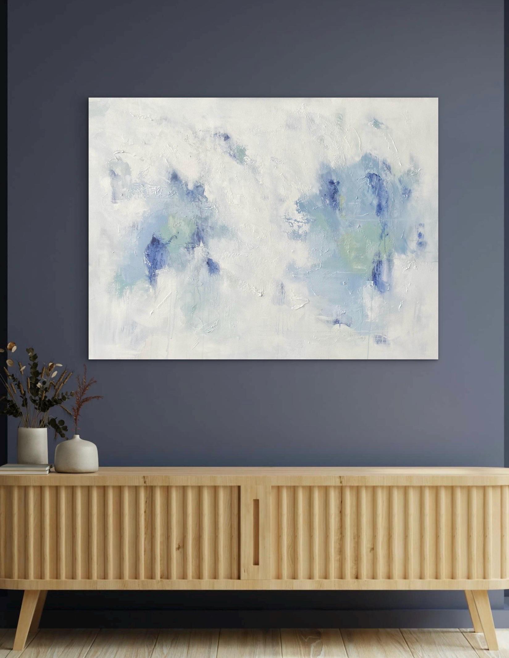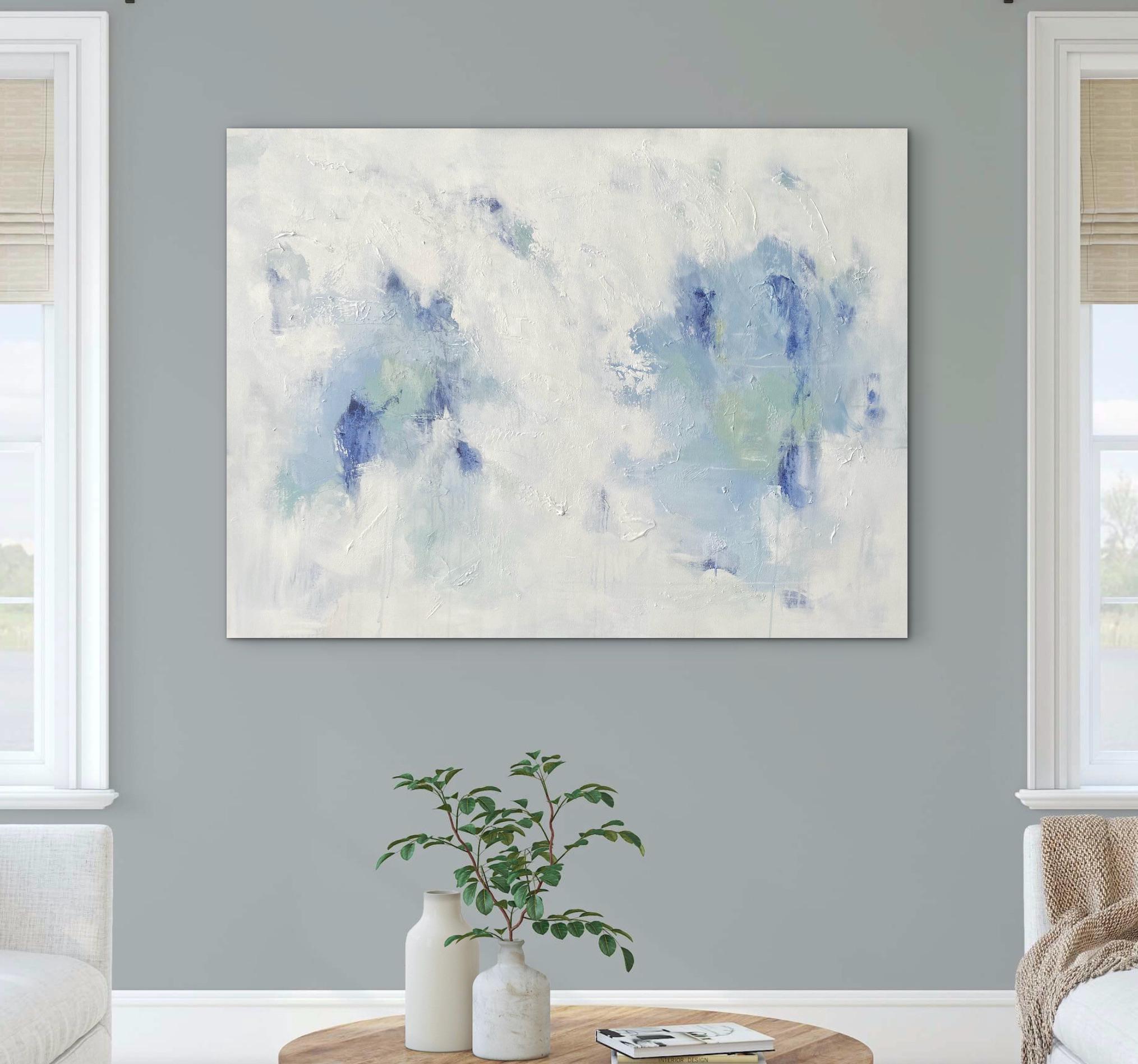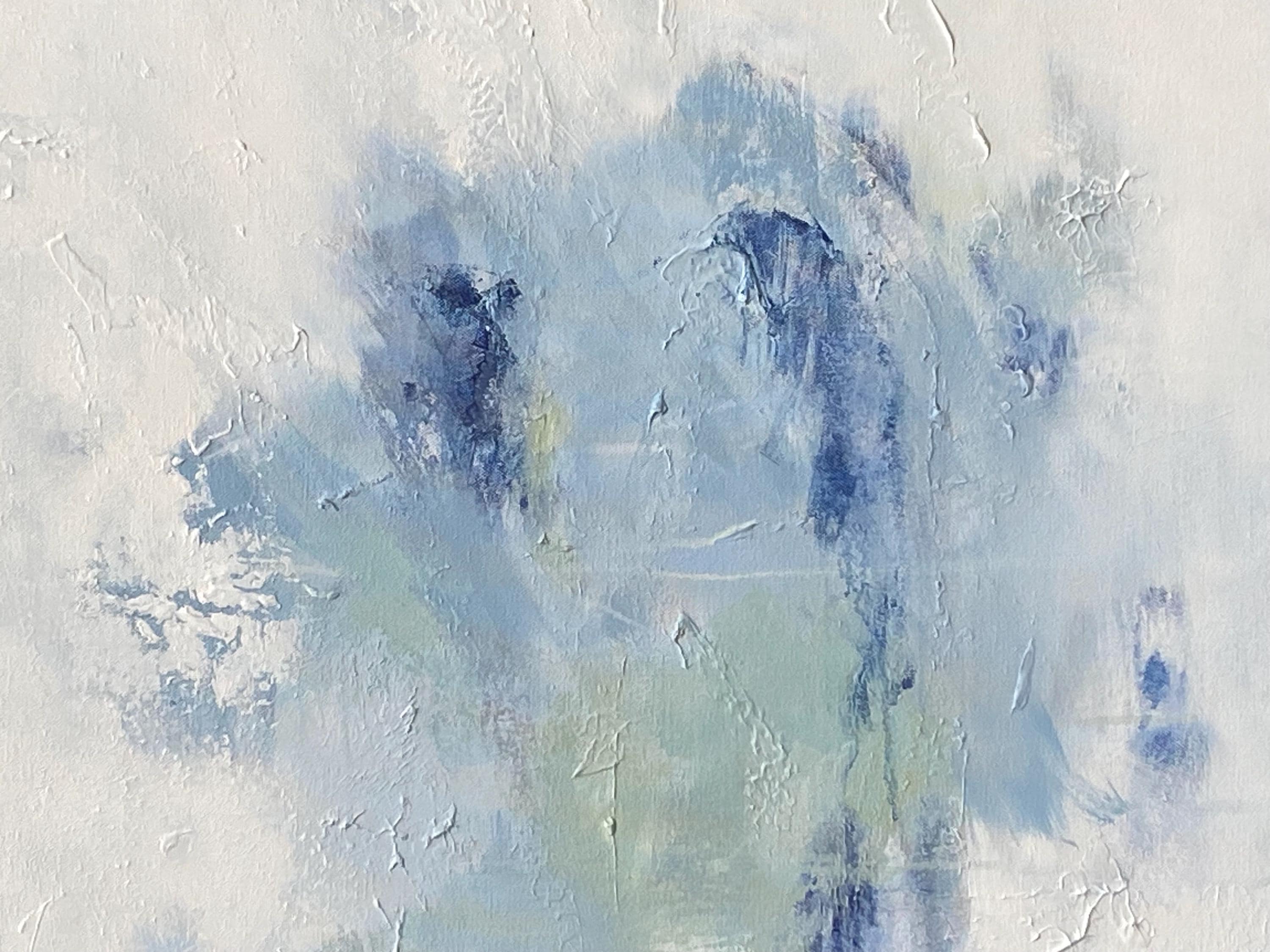This textured abstract painting creates a calming atmosphere. It is a reflection of inner peace. Soft layers of both warm and cool muted blues drift across the surface, creating a gentle rhythm of movement and rest. The composition feels open yet grounded, as if something has slowly come into balance. The texture throughout the piece adds dimension.