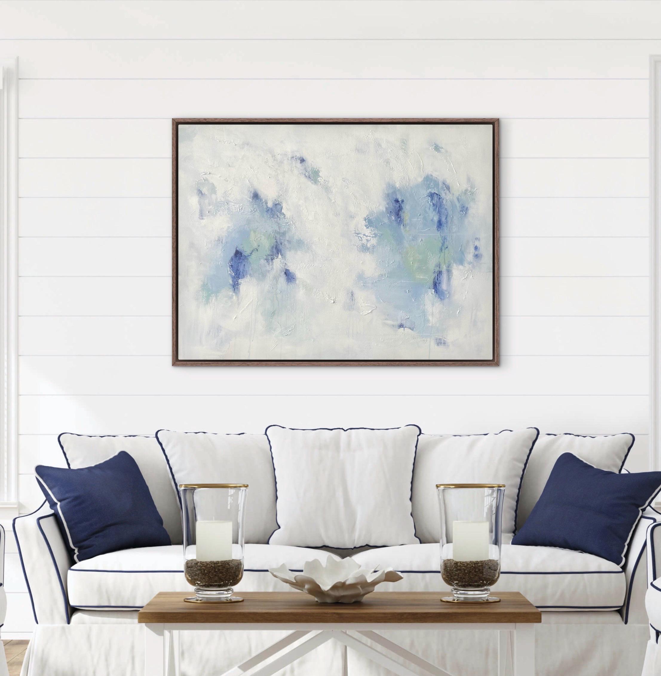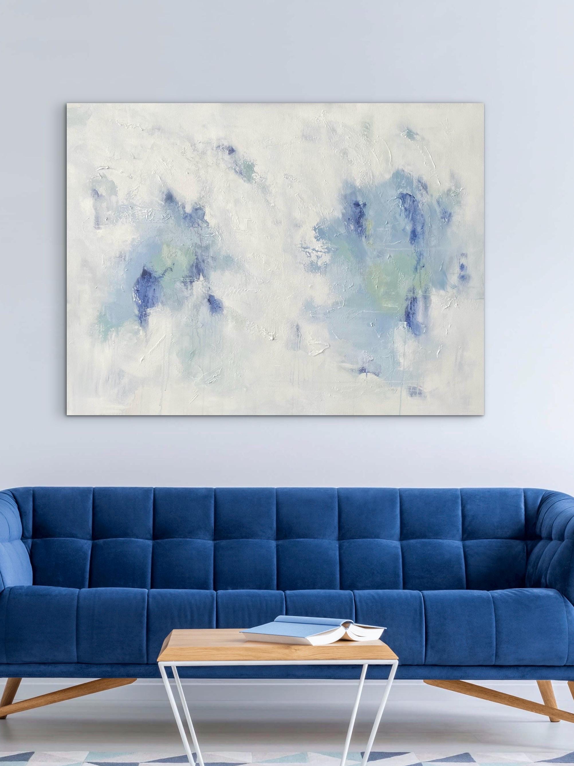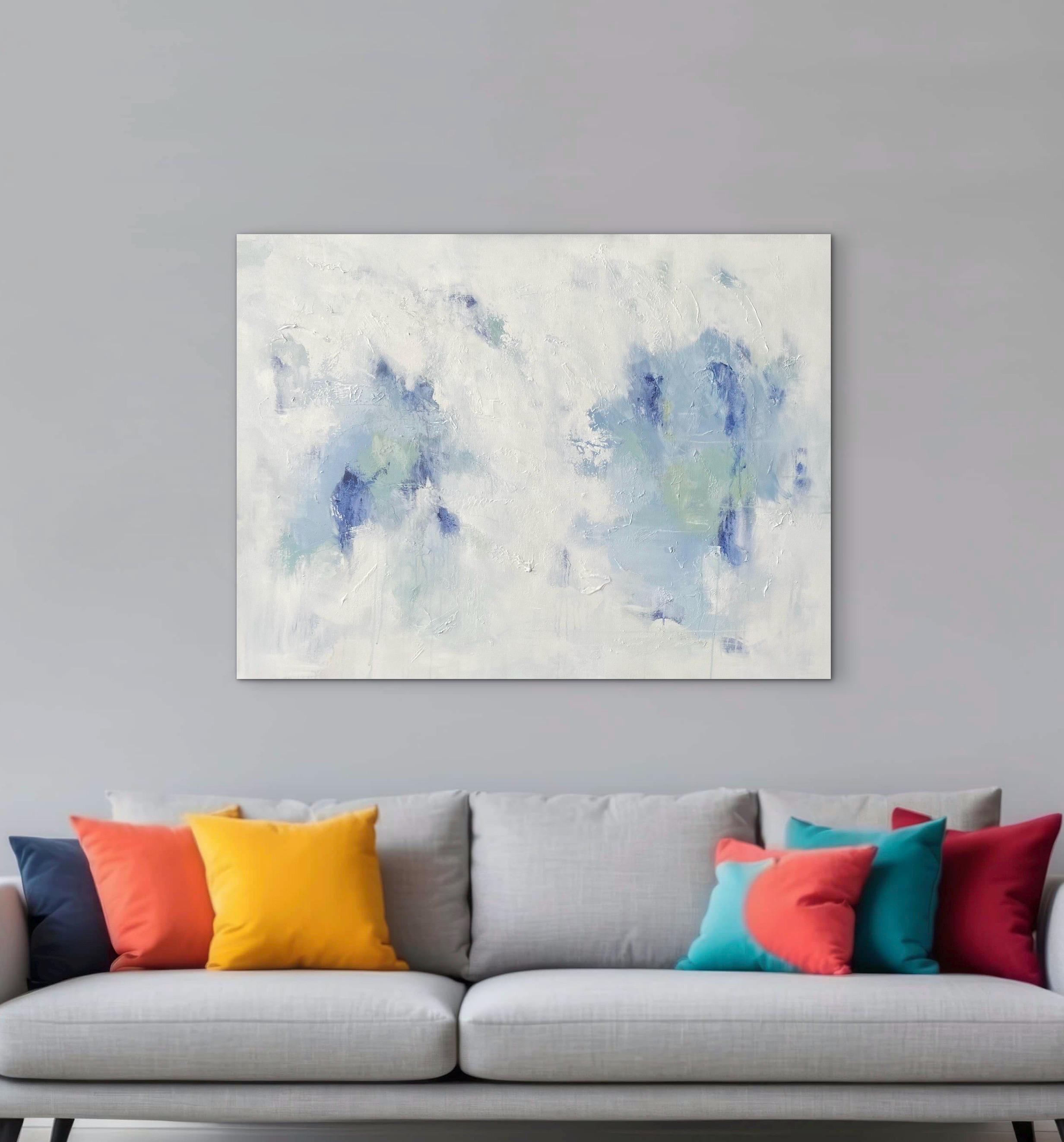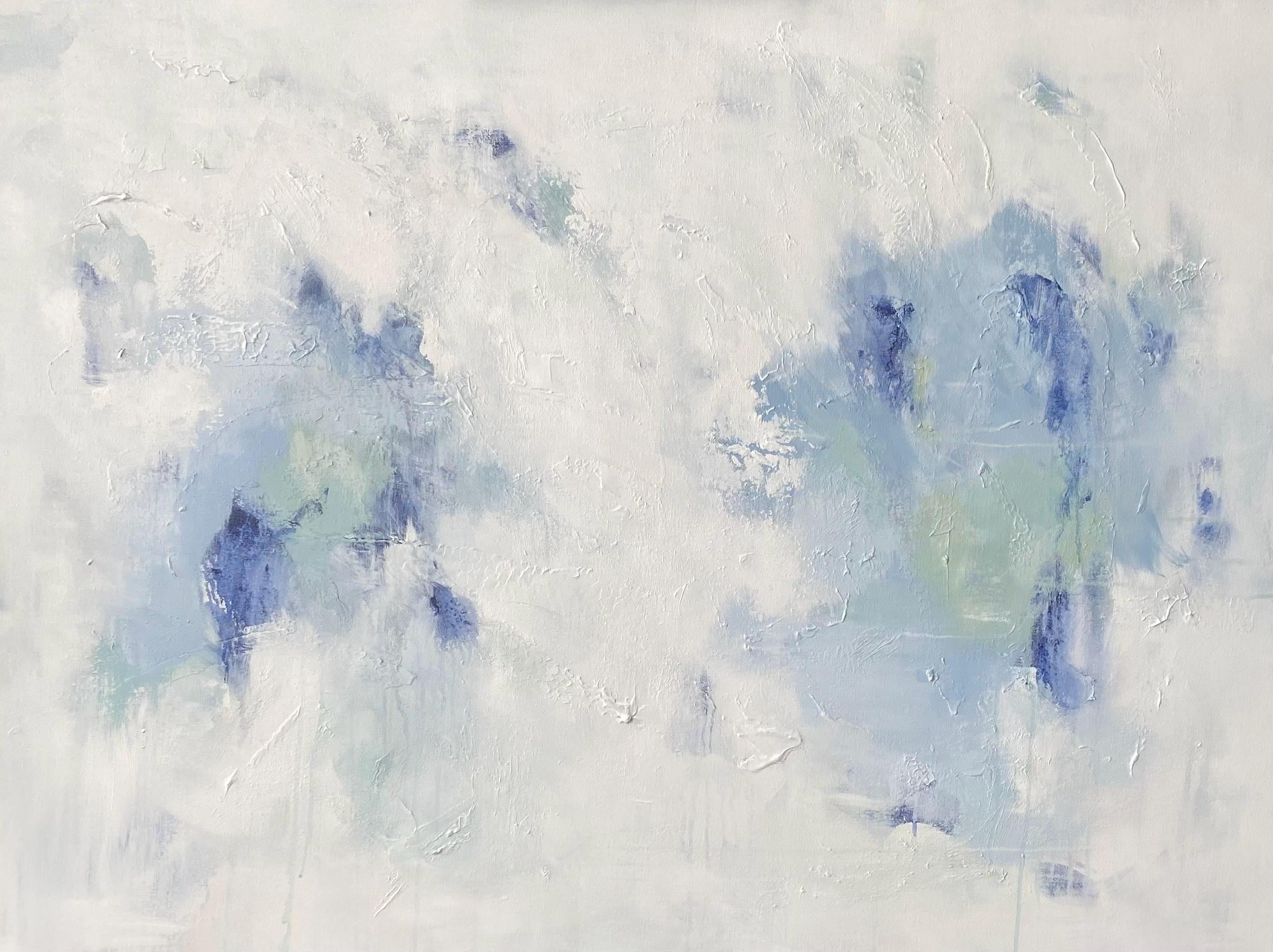 This textured abstract painting creates a calming atmosphere. It is a reflection of inner peace. Soft layers of both warm and cool muted blues drift across the surface, creating a gentle rhythm of movement and rest. The composition feels open yet grounded, as if something has slowly come into balance. The texture throughout the piece adds dimension.