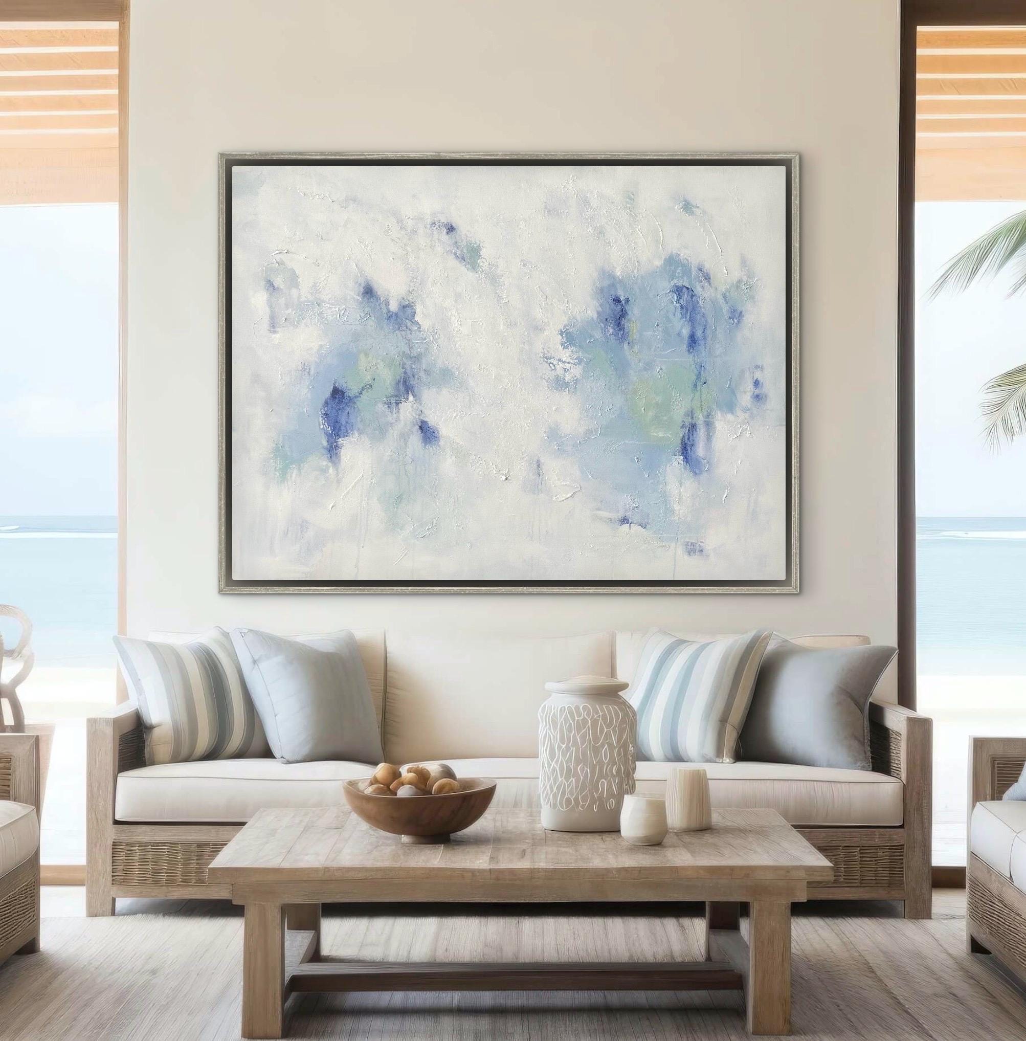 Shades of blue-gray, cloud blue, sea-foam, warm off-white, and touches of navy create a peaceful vibe.